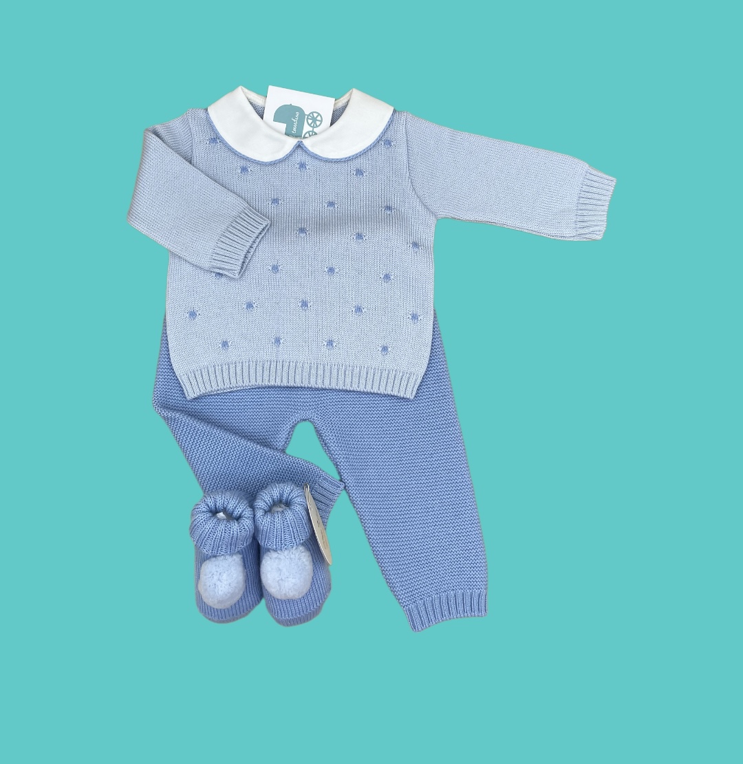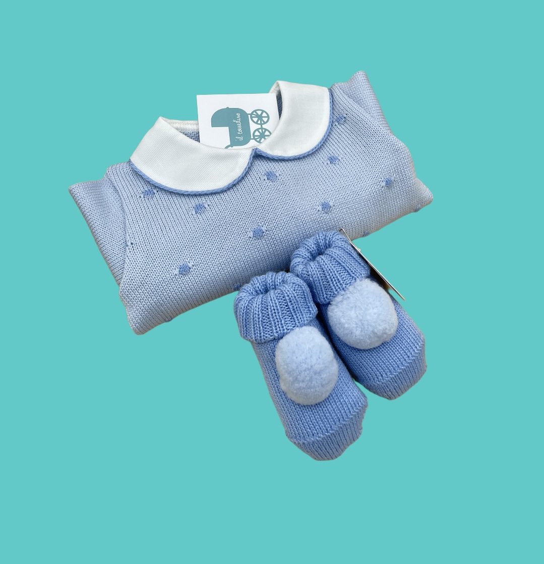 Tenero completino con scarpe coordinate realizzate in azzurro e cielo in pura lana con scarpe coordinate.