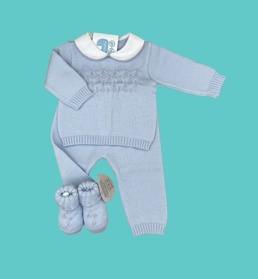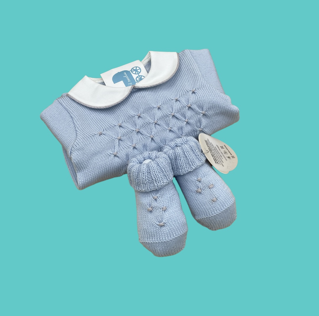 Dolcissimo completino in pura lana cielo con lavorazione nido d’ape, e dettagli in sabbia, con scarpe coordinate.