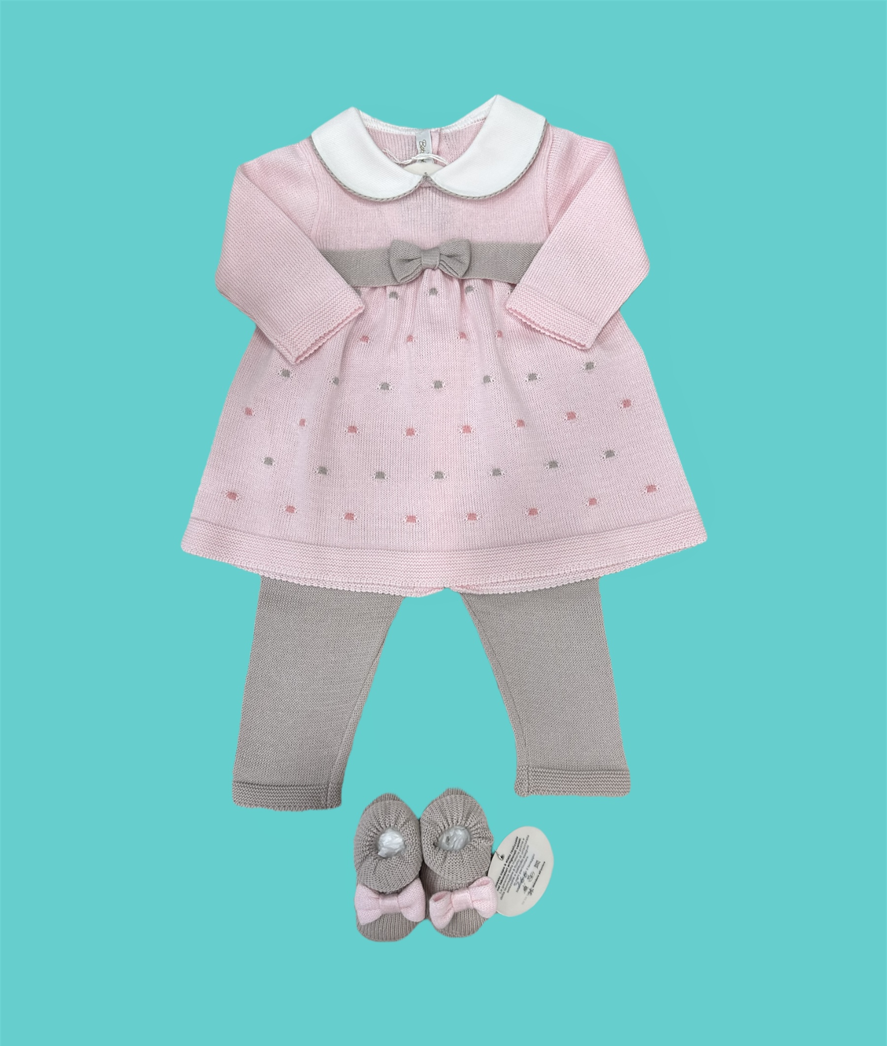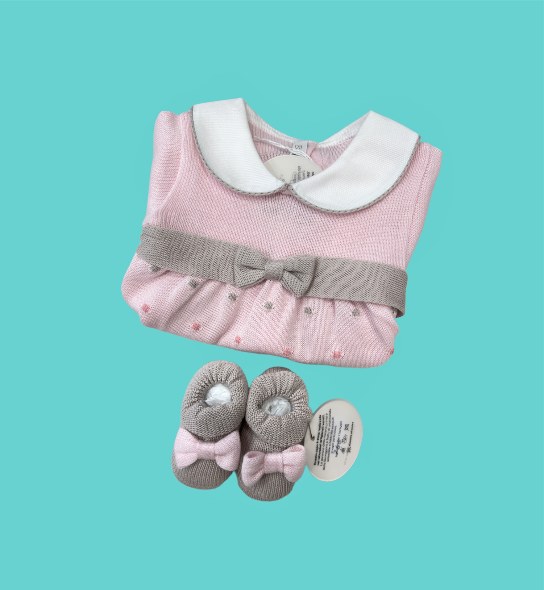 Dolcissimo completino realizzato in pregiato filo di cotone con scarpe coordinate.