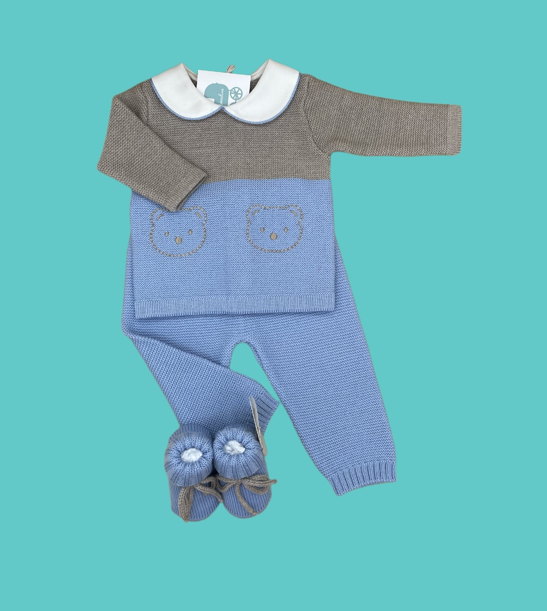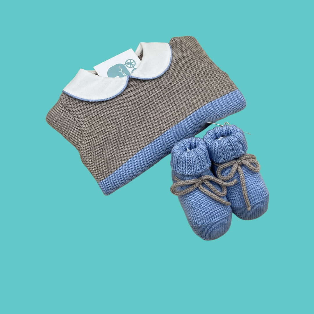 Dolcissimo completino in pura lana realizzato in tortora e avio con scarpe coordinate.