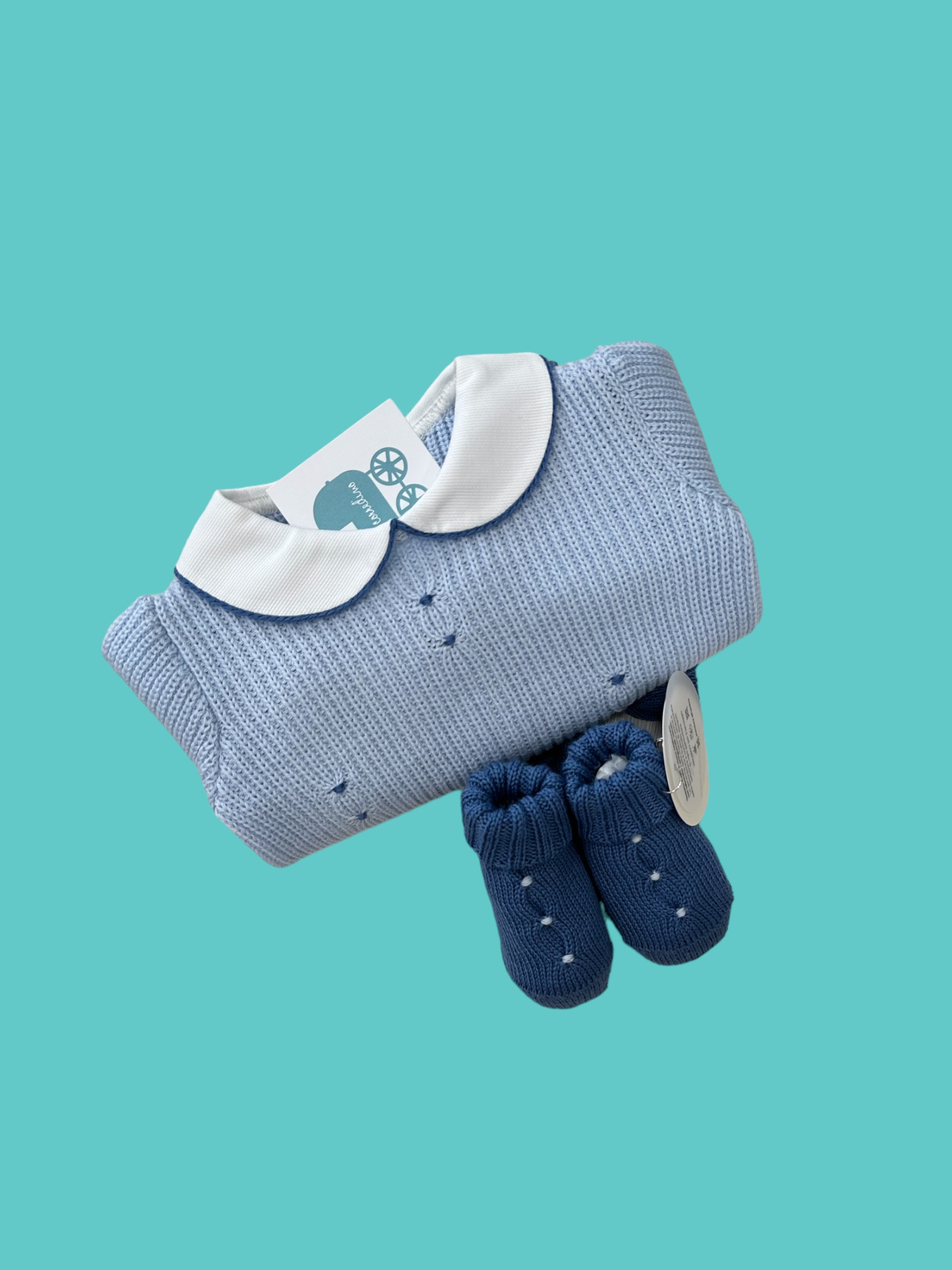 Delizioso completino cielo e avio con scarpe coordinate, realizzato in pregiata lana made in Italy.