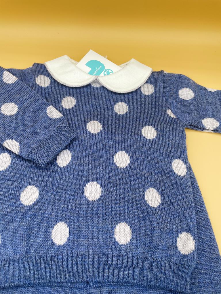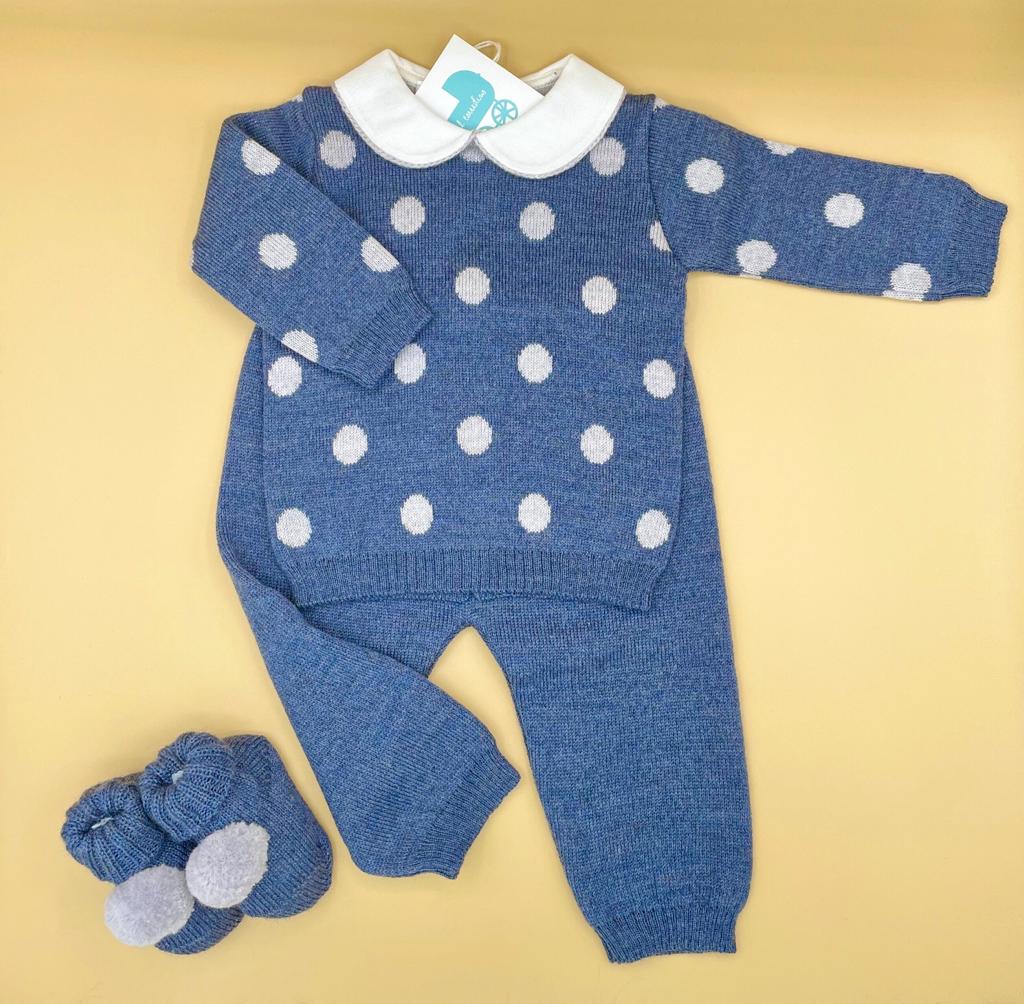 Dolcissimo completino con scarpe in pura lana made in Italy realizzato con i toni del blu e grigio.
