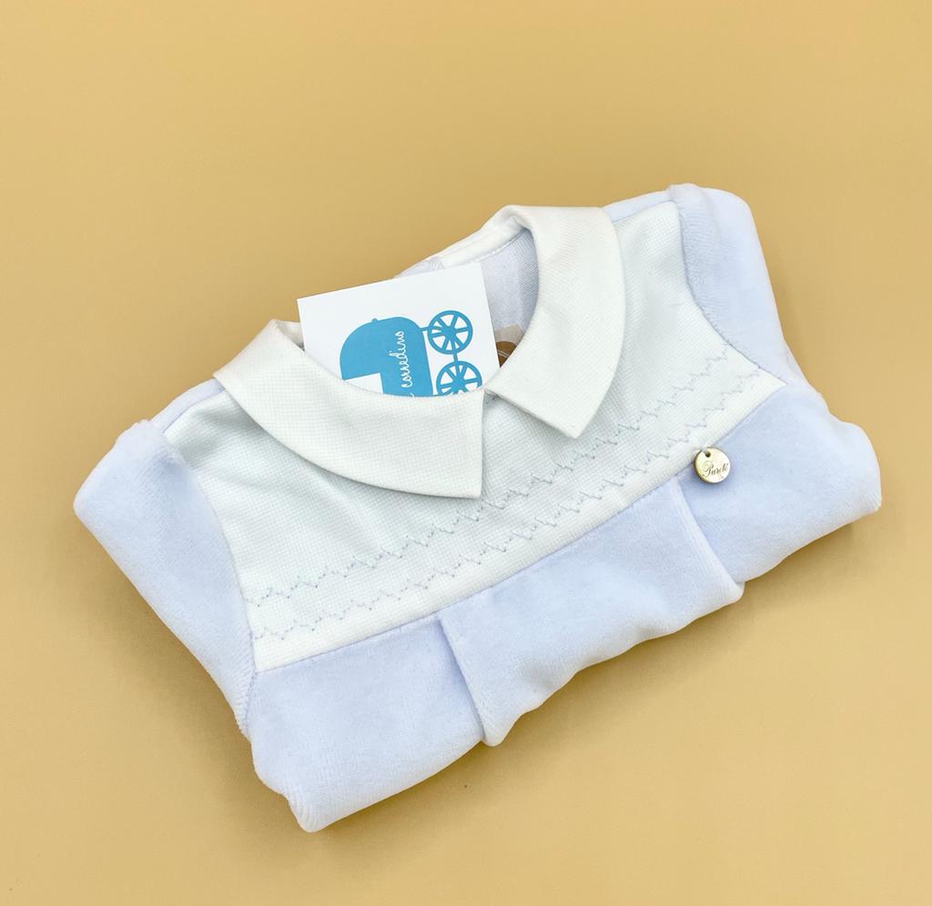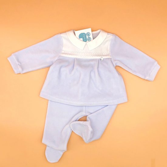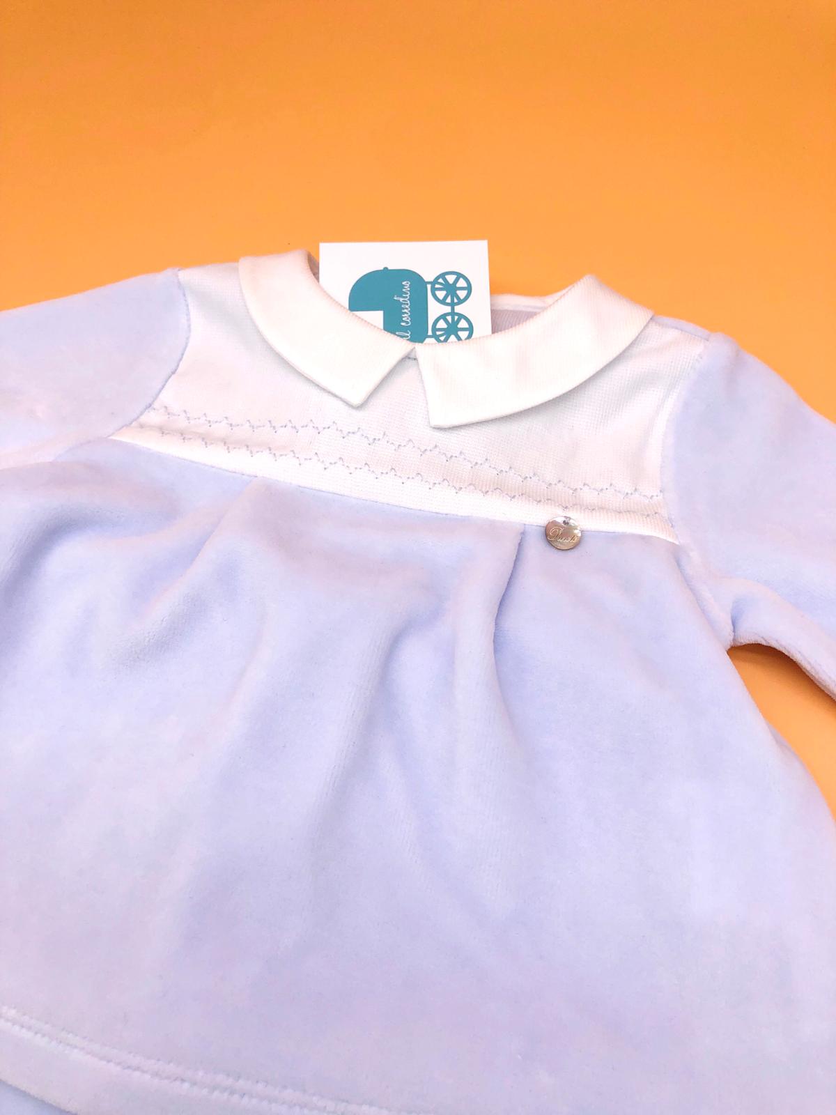 Delizioso completino in ciniglia celeste con dettaglio con smock nel corpetto.