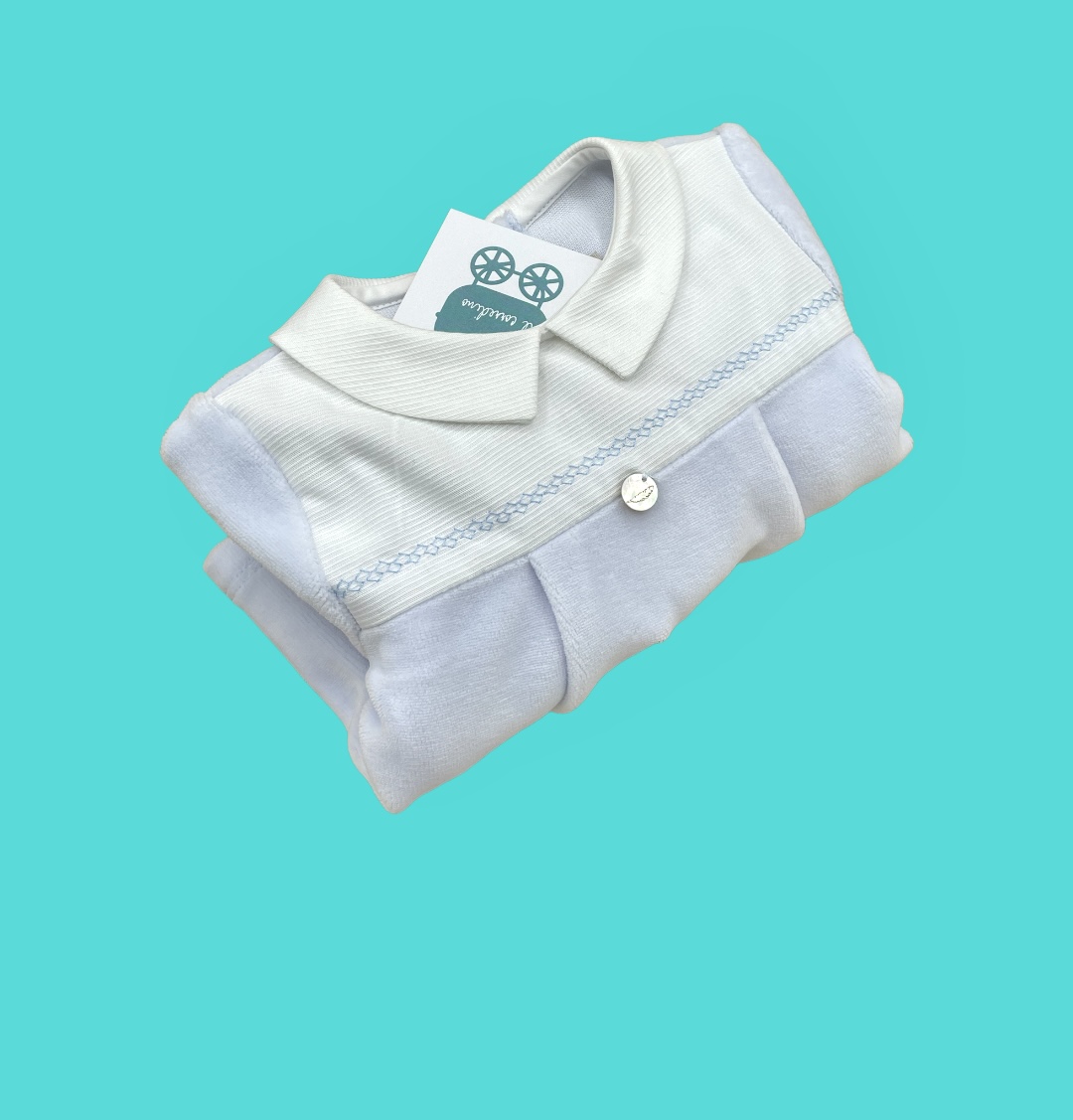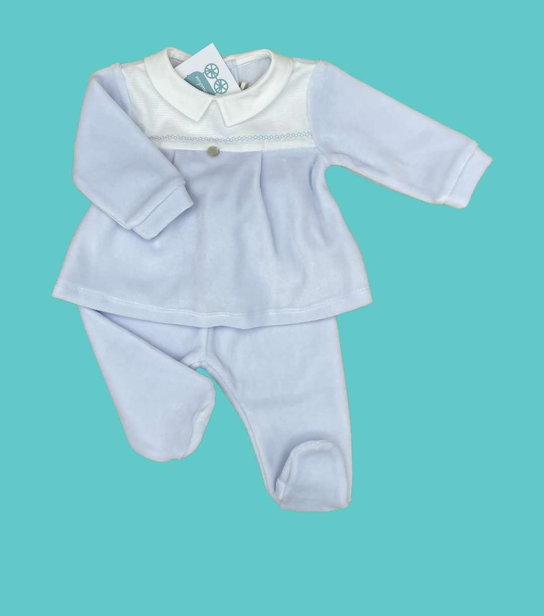 Dolce e raffinato completo in morbida ciniglia celeste.