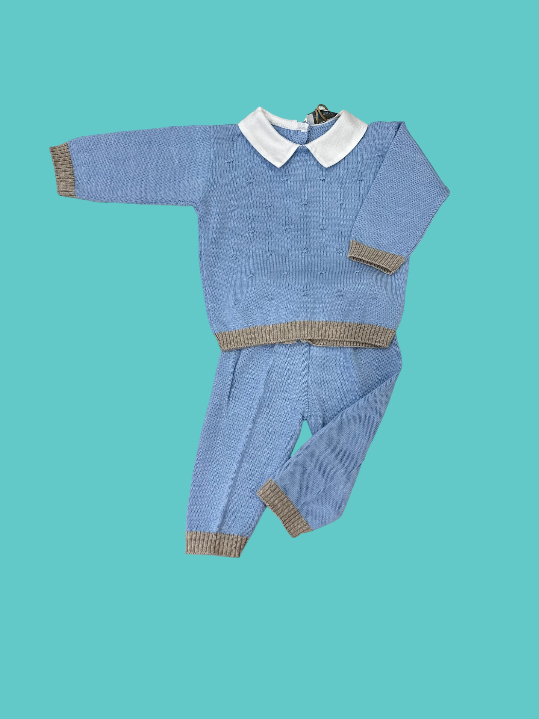 tenero completino in misto lana realizzato in azzurro avio con perfili in color corda.