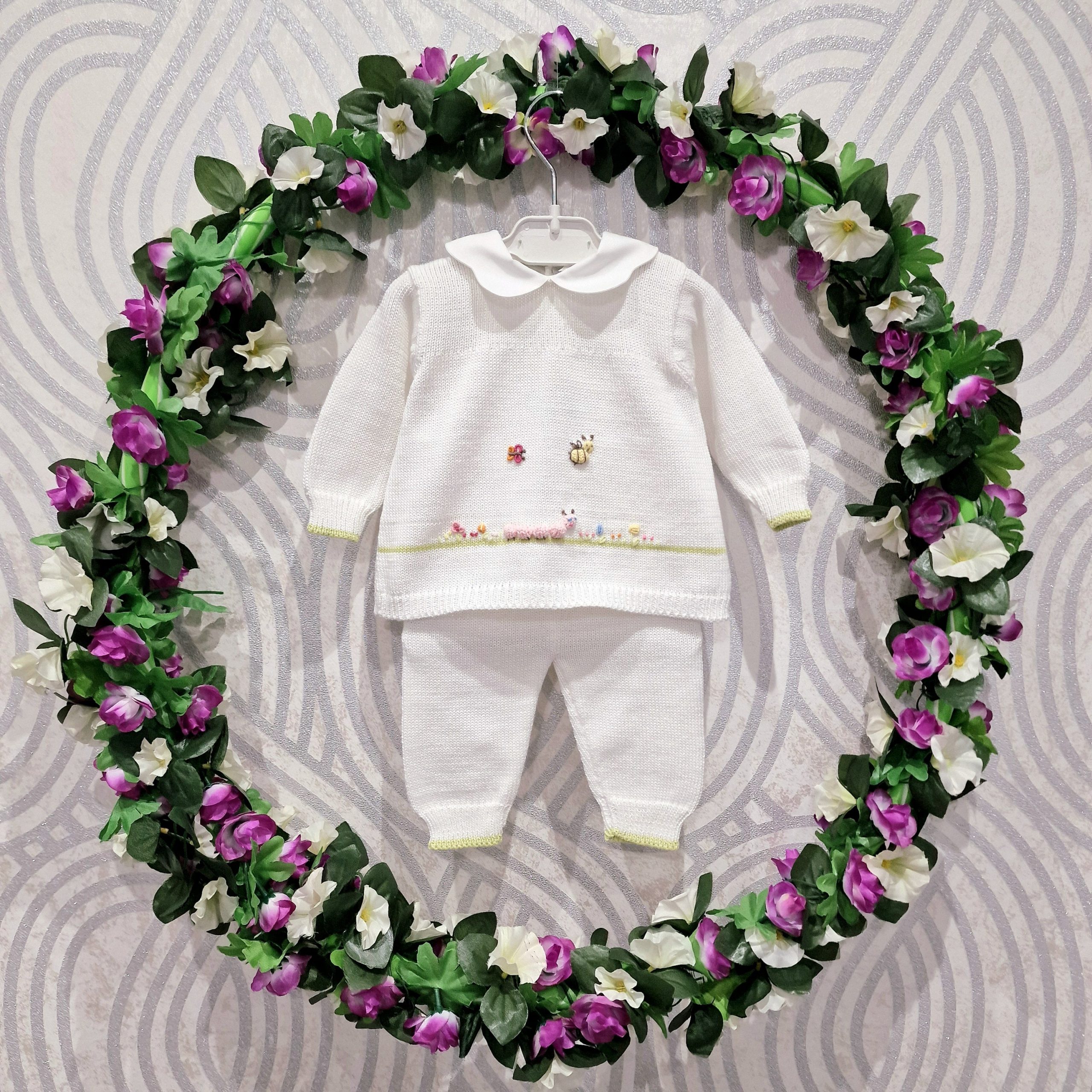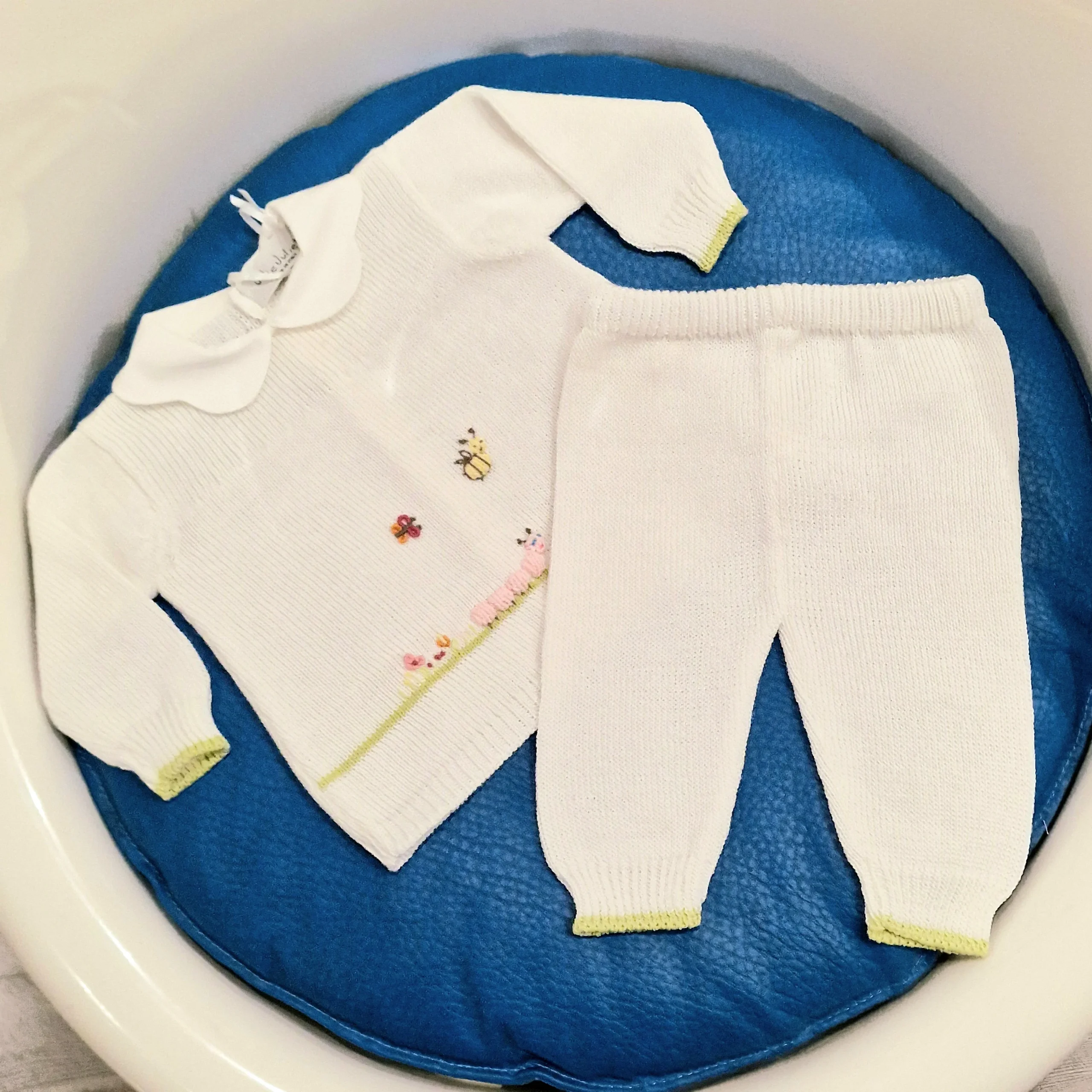 Completo 100% cotone in filo, ricamo bruco e api sul davanti. Il prezzo è comprensivo di babbucce.