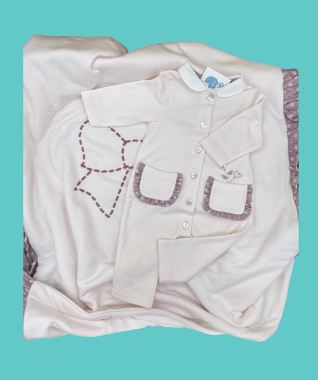 Delizioso coordinato in felpa di cotone con tutina e coperta rosa.