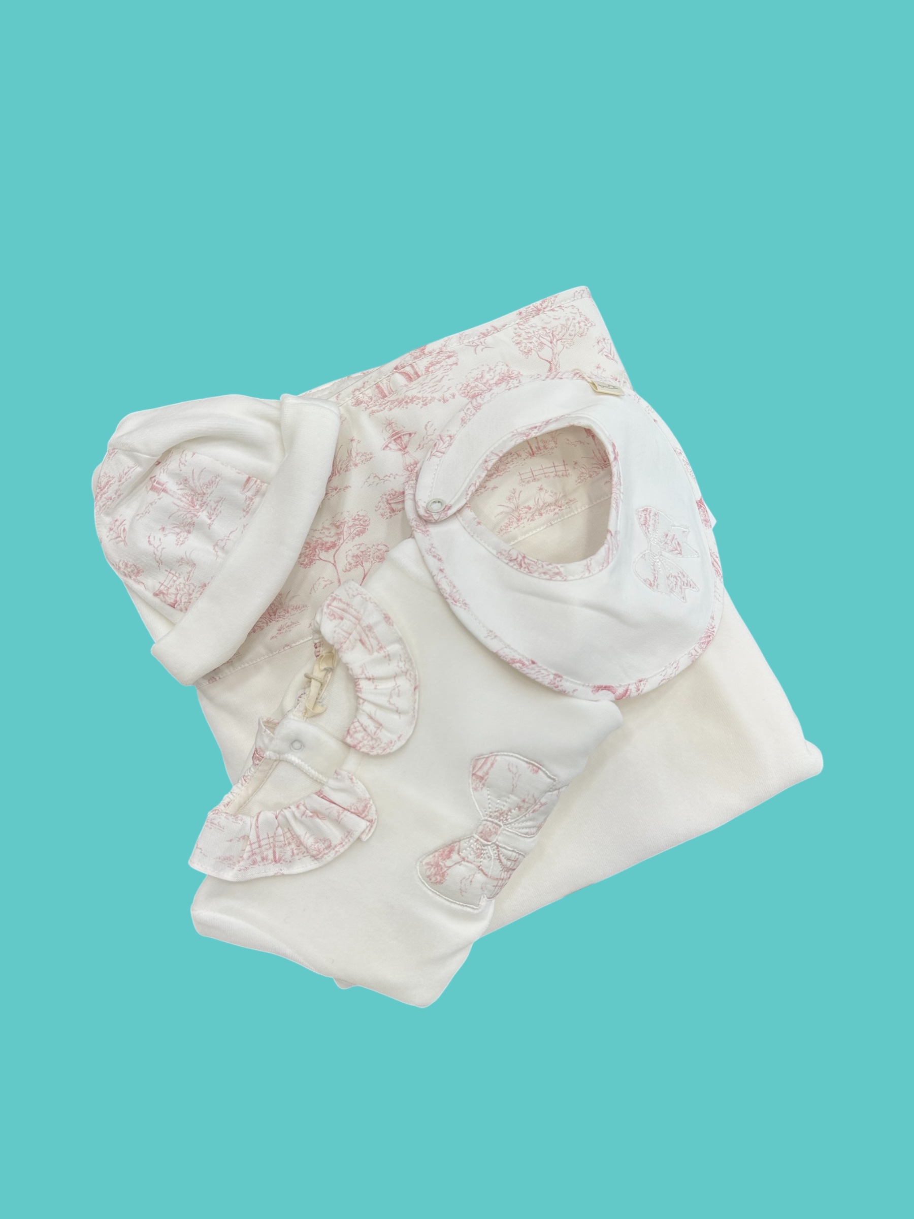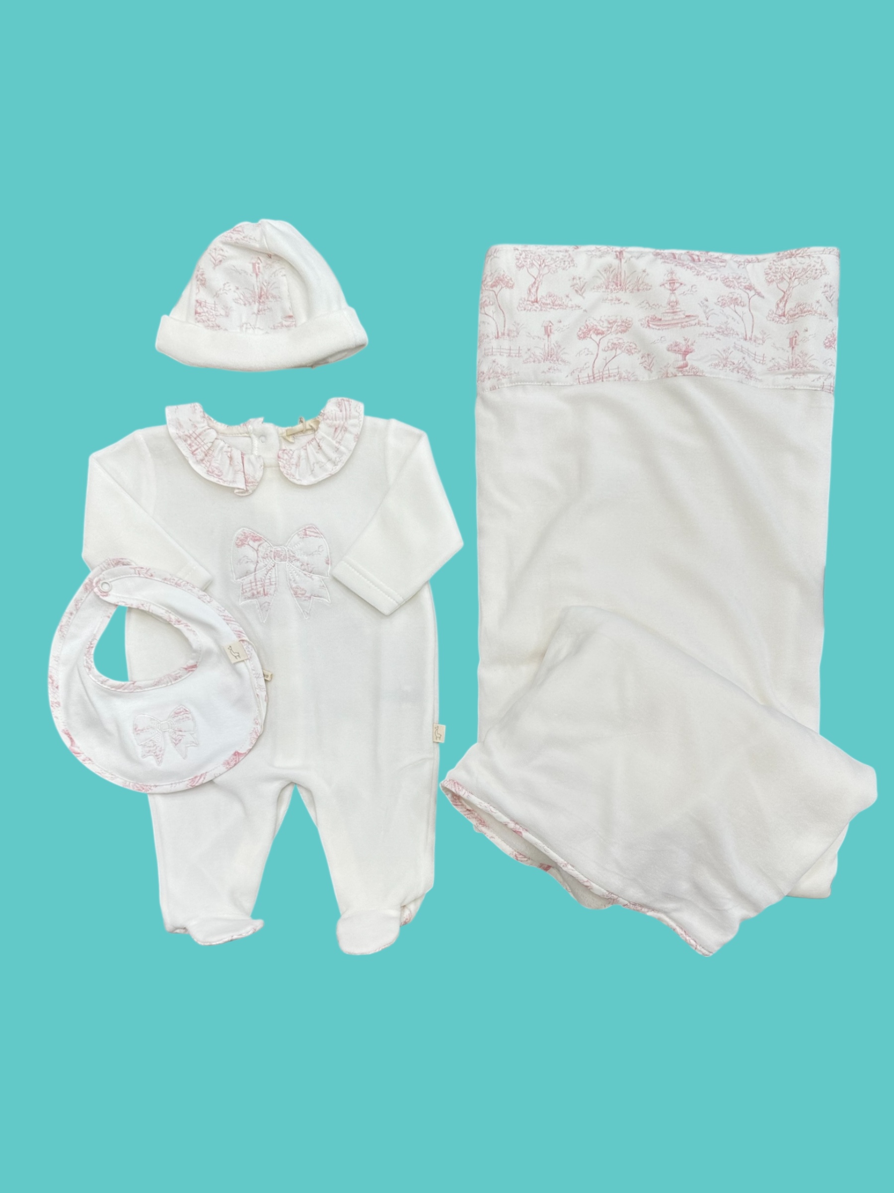 Coordinato in ciniglia con : tutina, cappello, bavetta e coperta made in Portogallo 80% cotone 20% poliestere