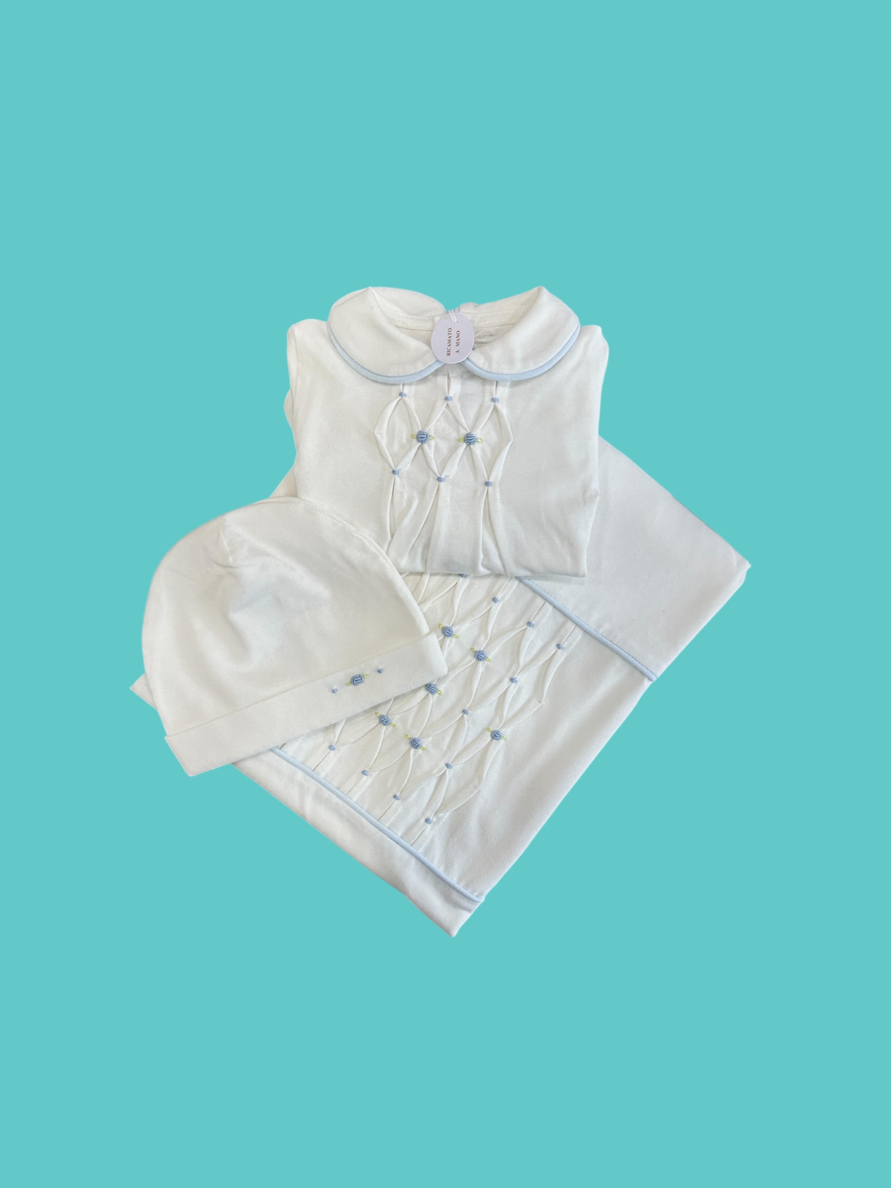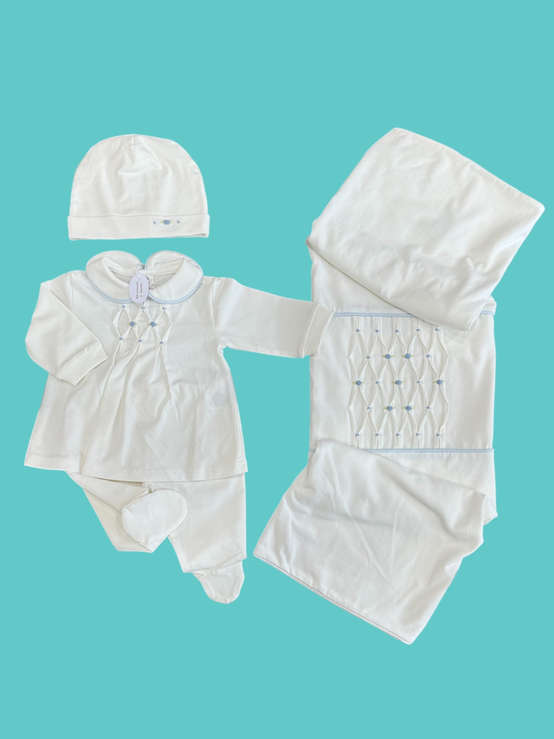 completino, coperta e cappello 100% jersey di cotone made in Italy prodotti ricamati a mano