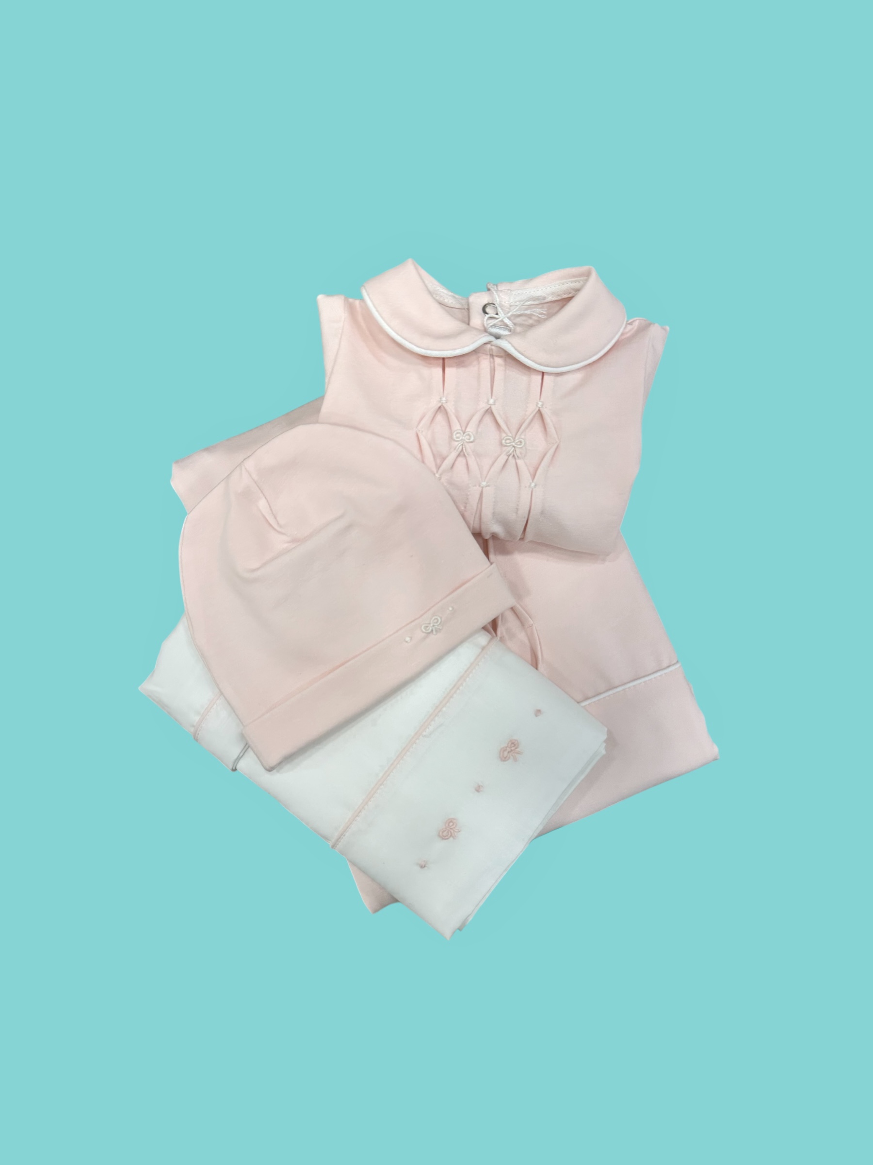 Coordinato tutina, cappello, lenzuolo 3pz, coperta 100% cotone prodotti ricamati a mano made in Italy