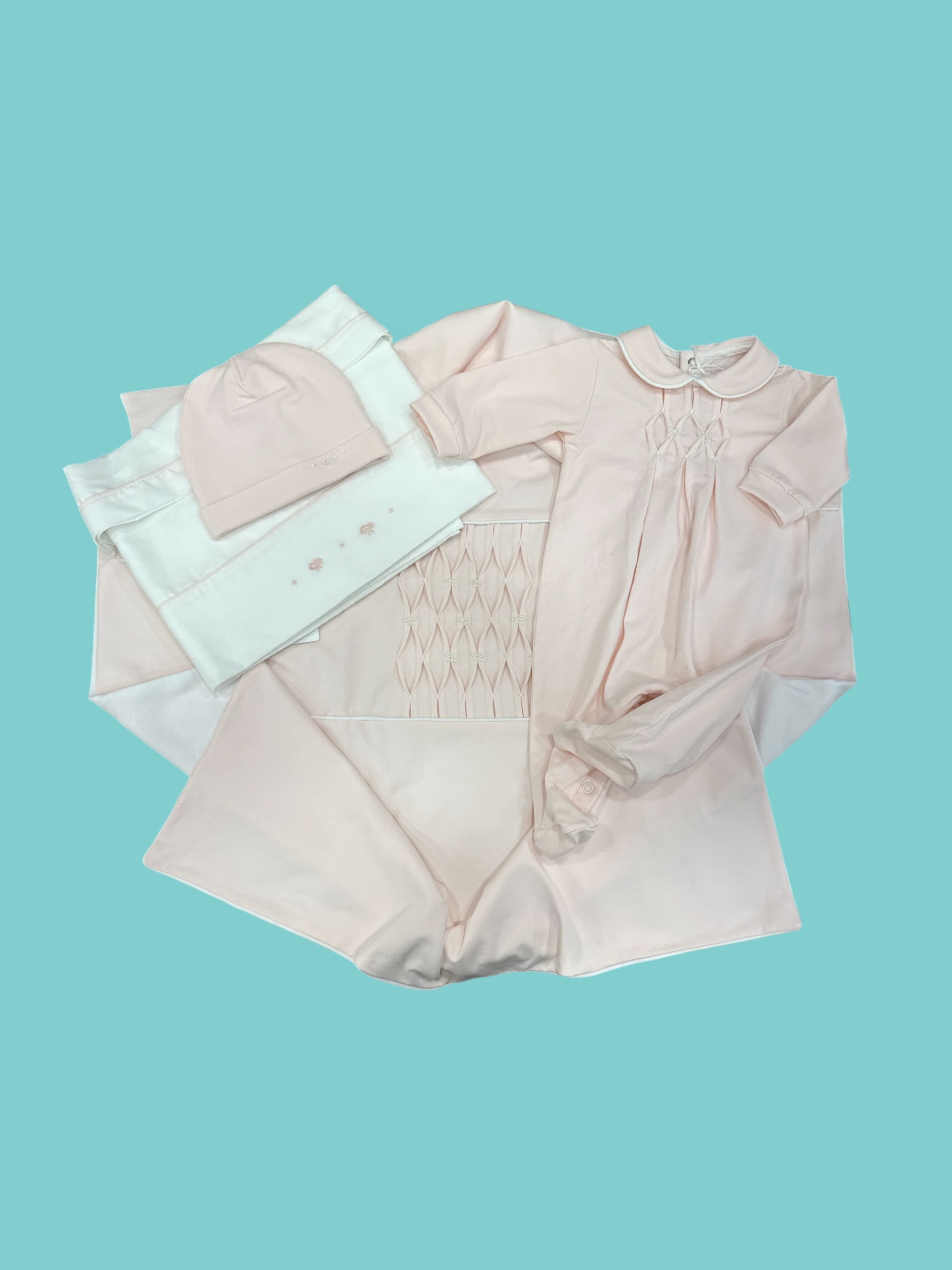Meraviglioso coordinato in morbidissimo cotone composto da tutina, lenzuolo 3pz, coperta e cappello.