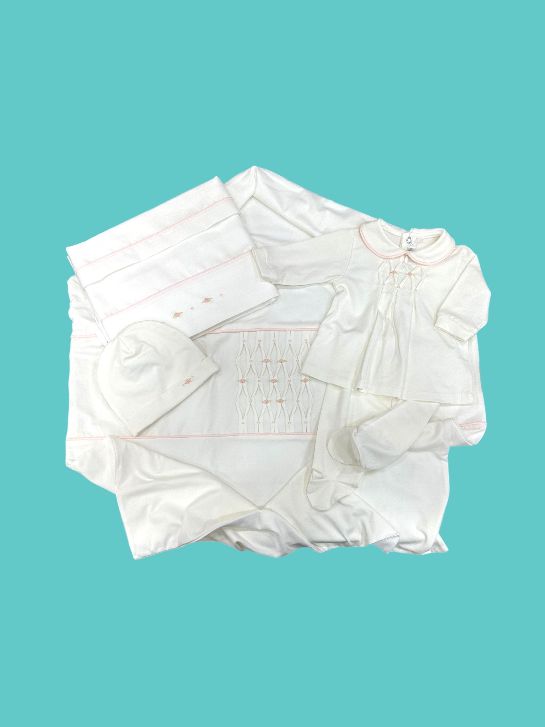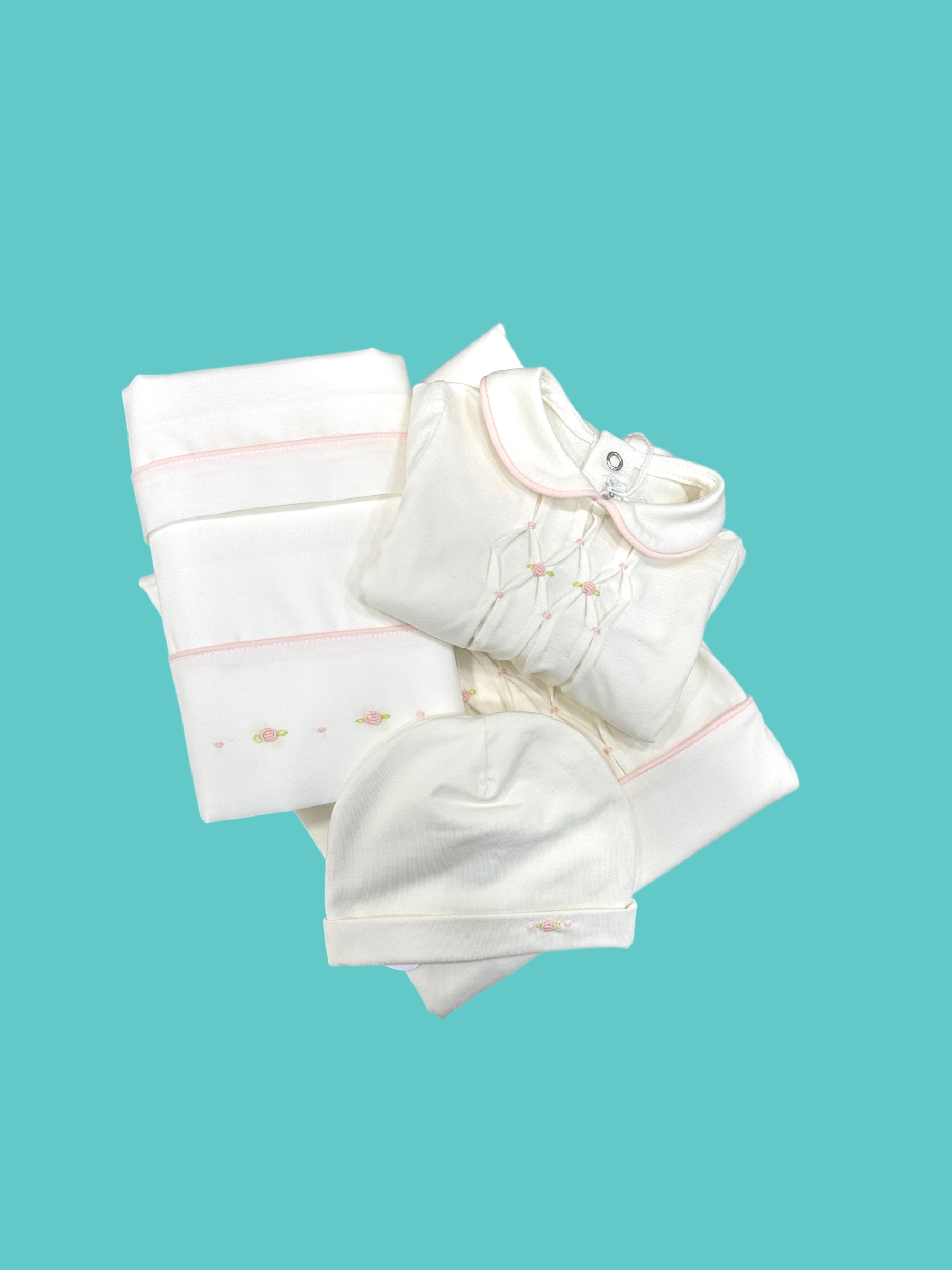 Meraviglioso coordinato in morbidissimo cotone composto da completino, lenzuolo 3pz, coperta e cappello.