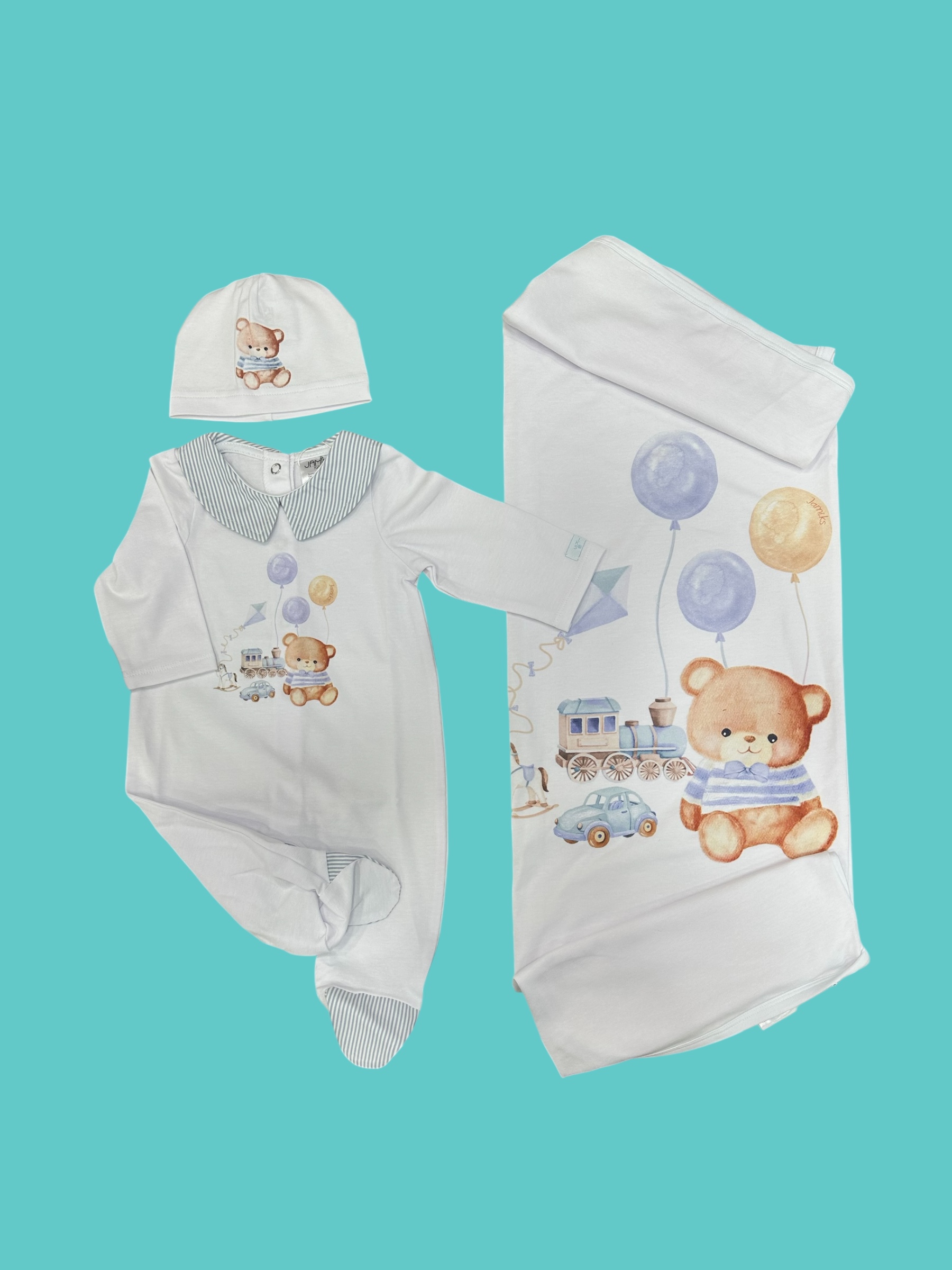 Morbido coordinato in cotone composto da coperta, tutina e cappello.