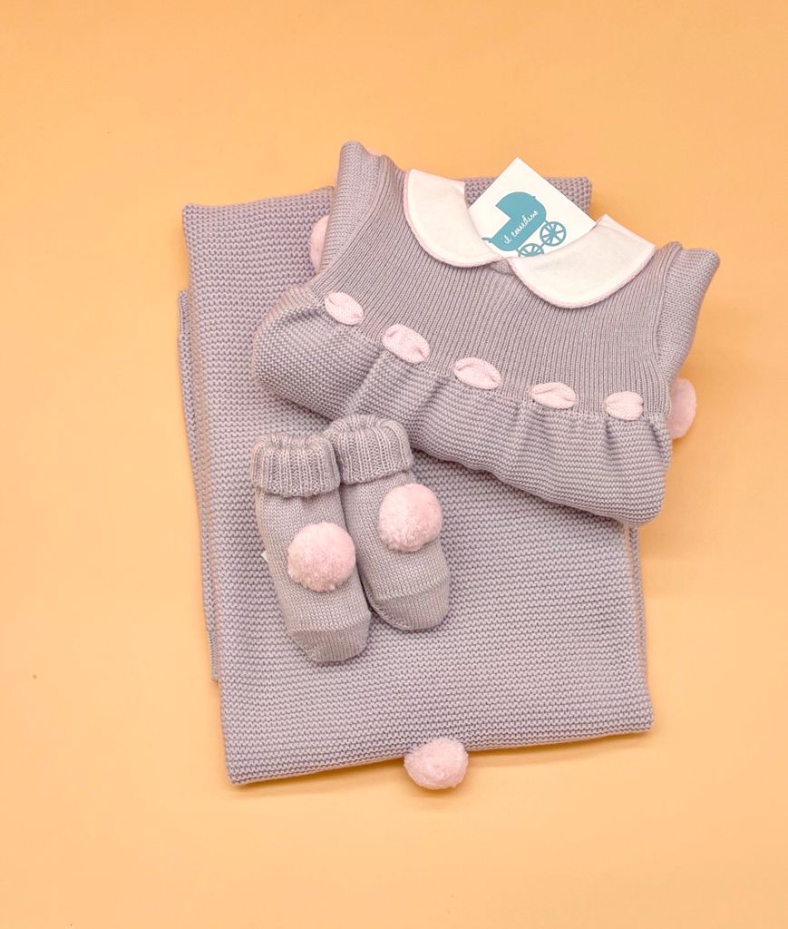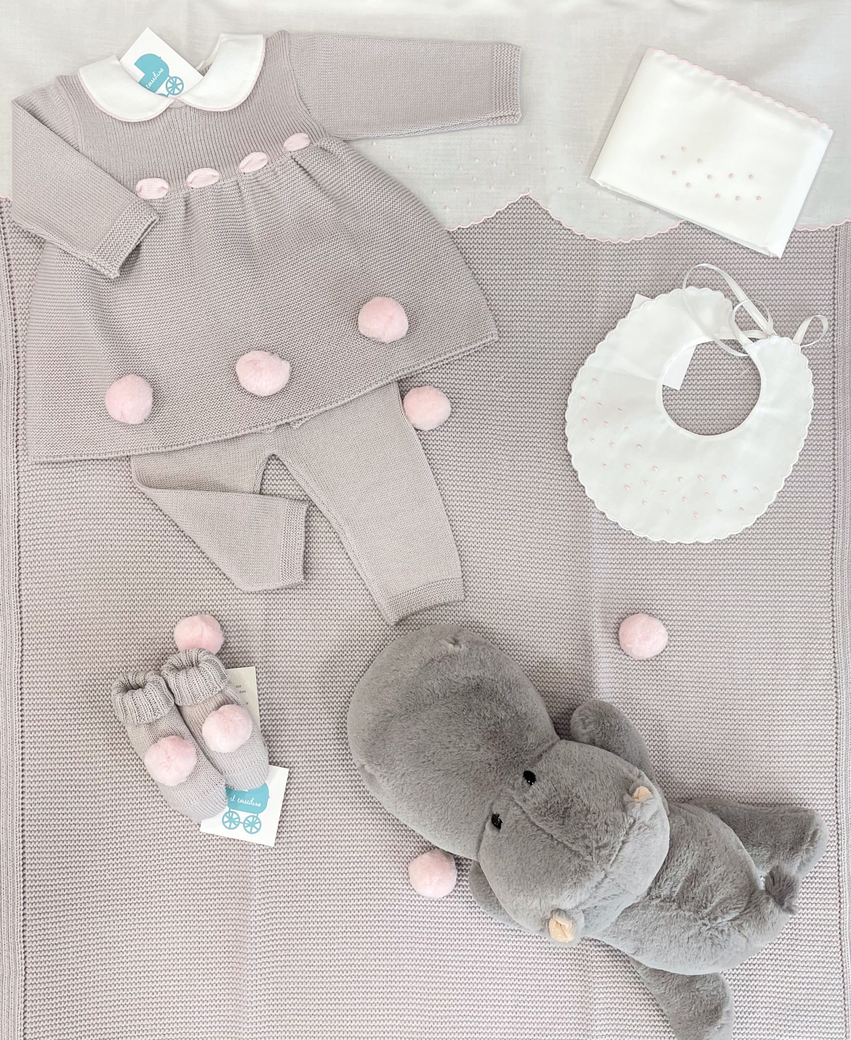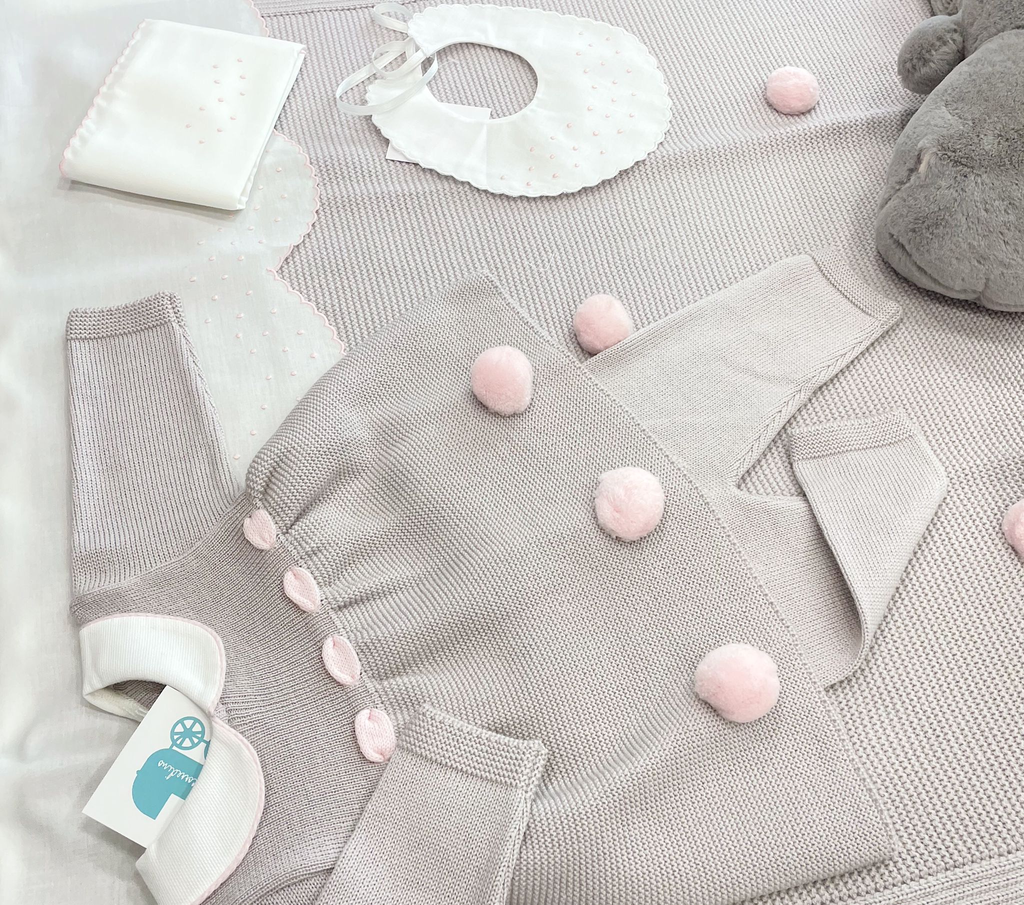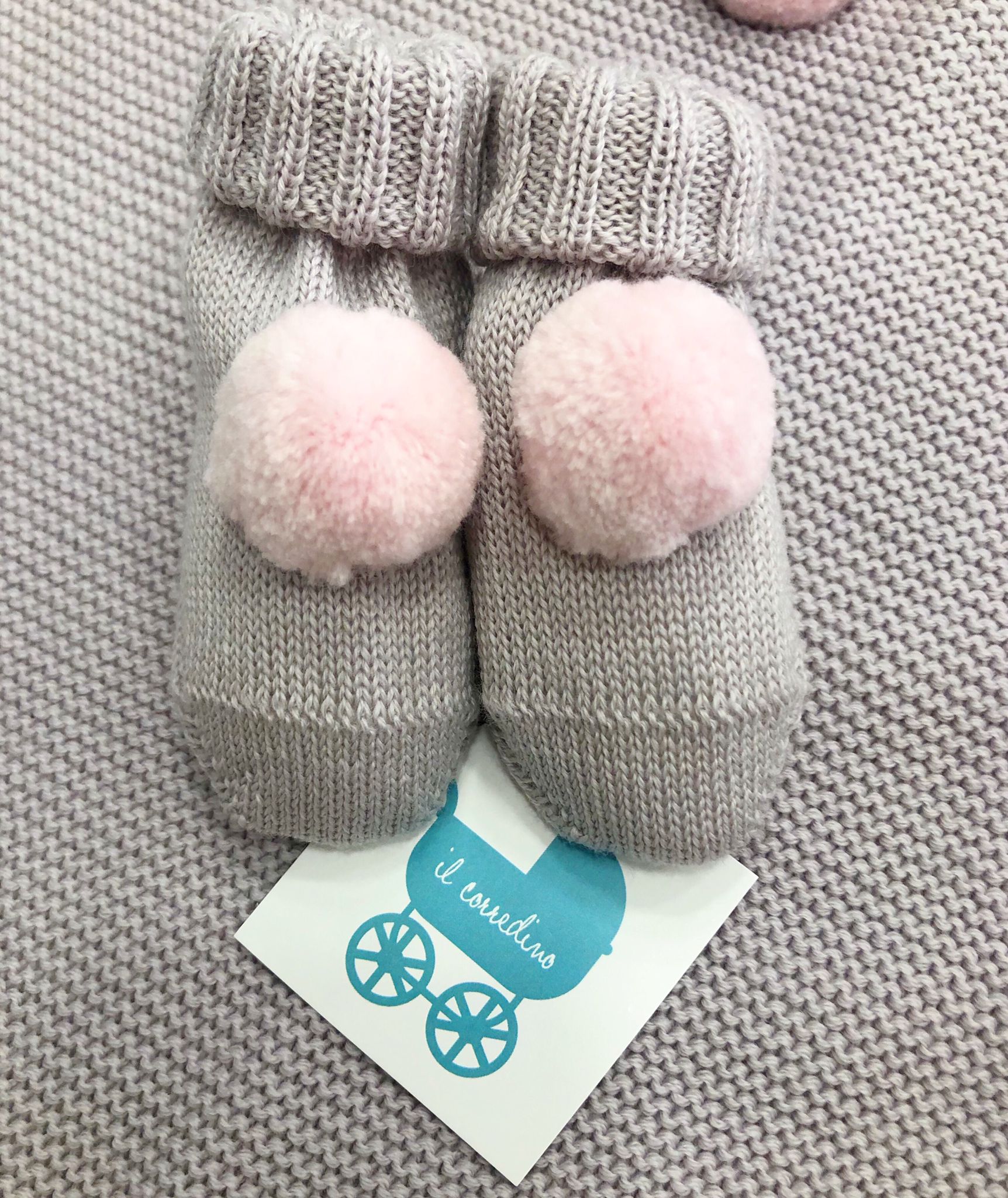 Simpatico ed originale coordinato in pura lana made in Italy color tortora con pon pon in rosa baby.
