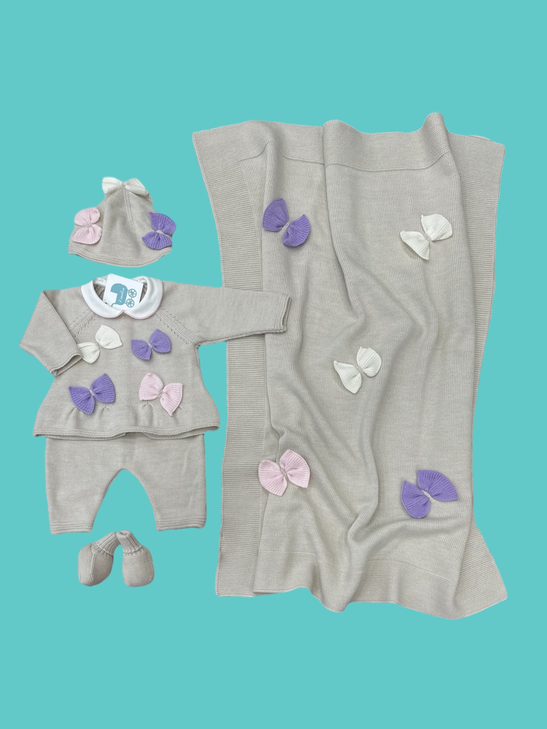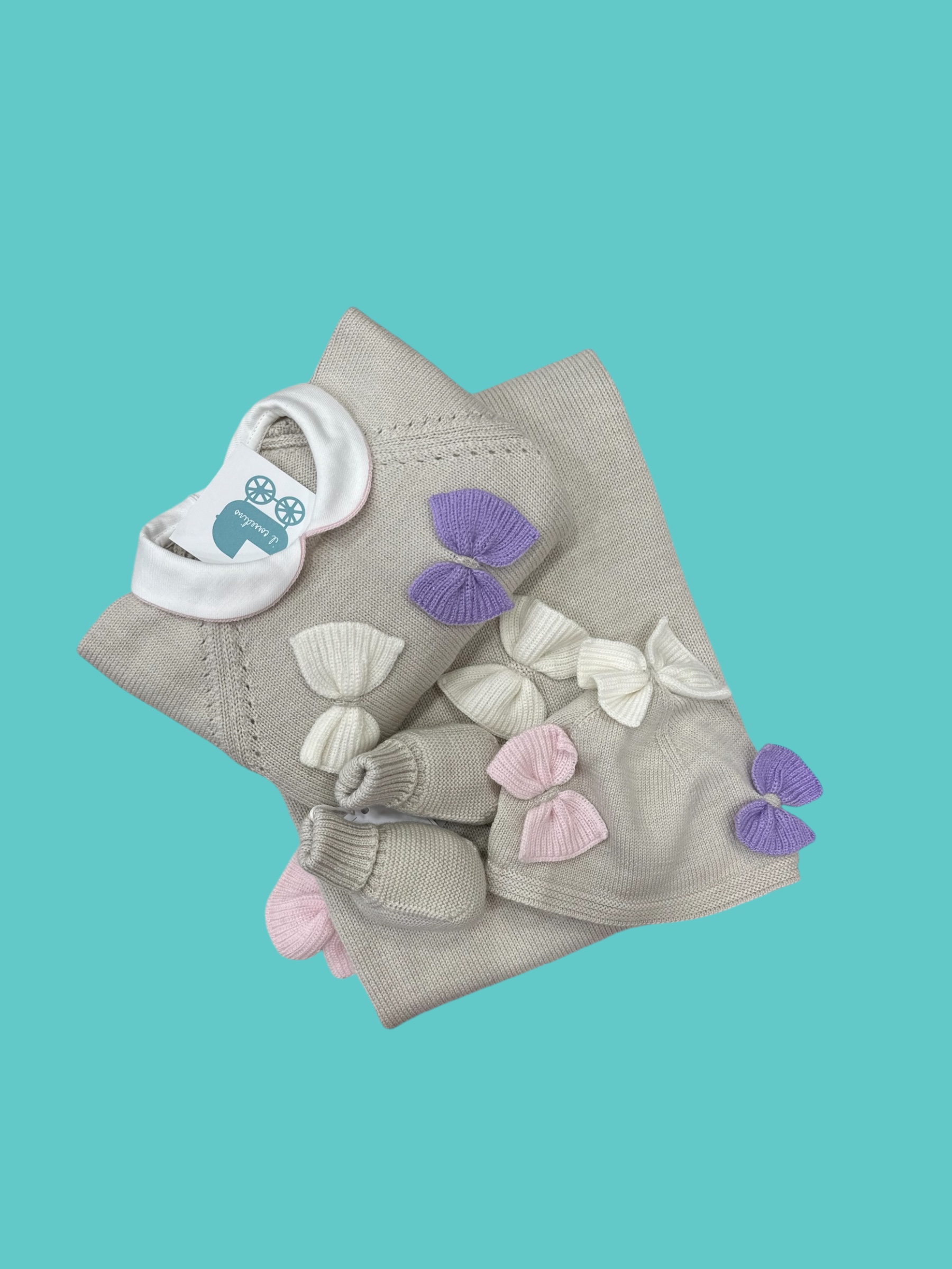 Coordinato coperta, completino, scarpe e cappello 100% lana made in Italy