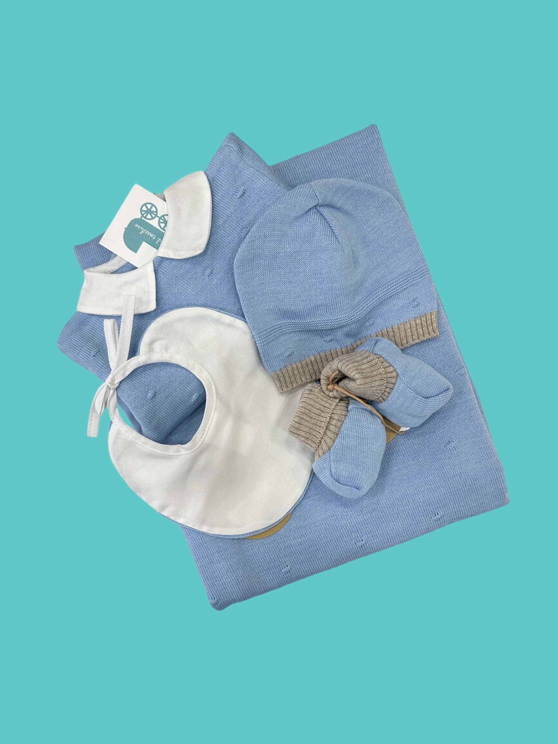 Delizioso coordinato avio composto da tutina, cappello, scarpe e coperta.