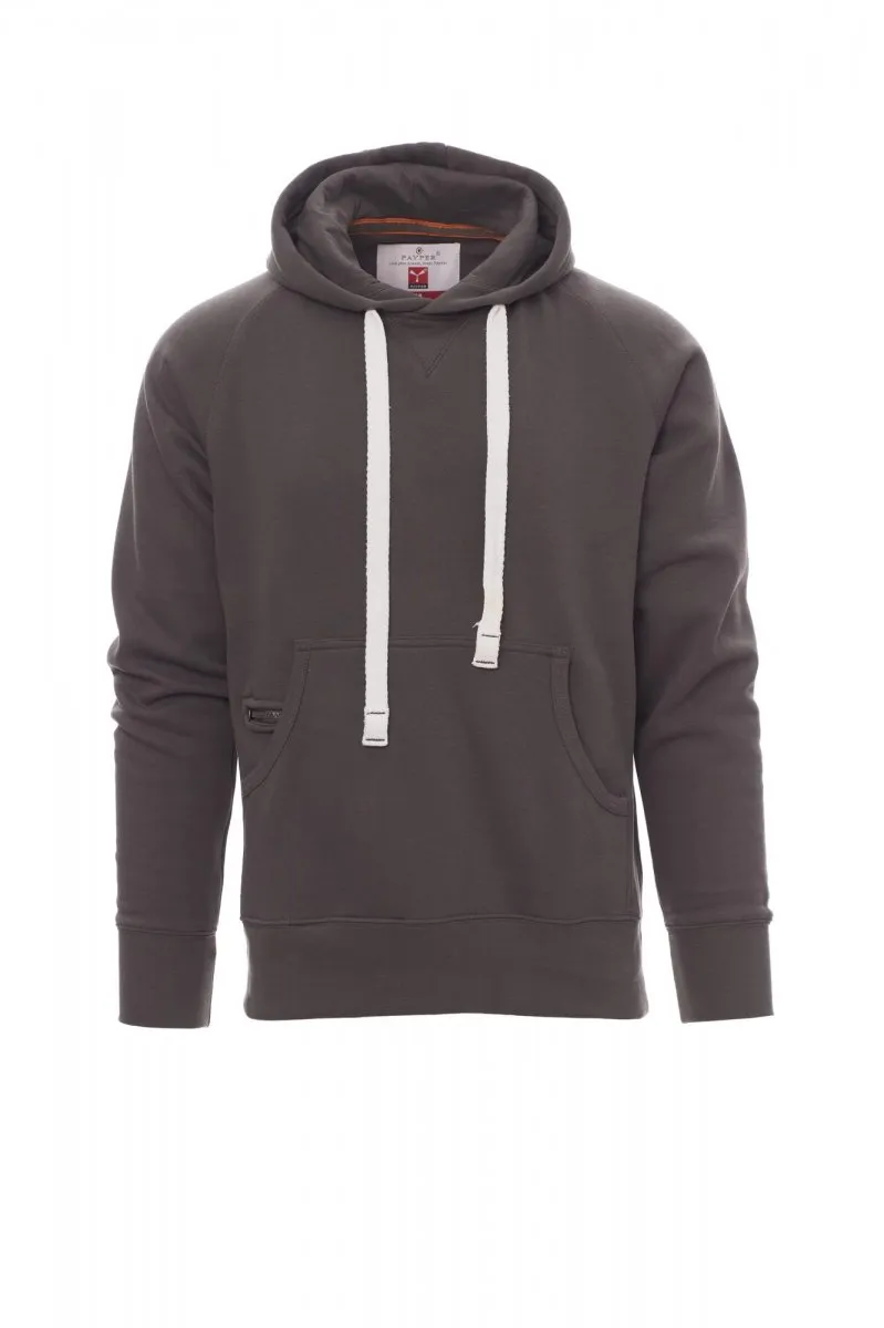 Felpa da uomo, cappuccio a due cuciture, coulisse bianca in corda con cuciture in tinta con la felpa e anelli in metallo, manica raglan, cucitura estetica a V al collo, tasche a marsupio, taschino con zip, polsini e vita in costina elasticizzata, cuciture rinforzate.