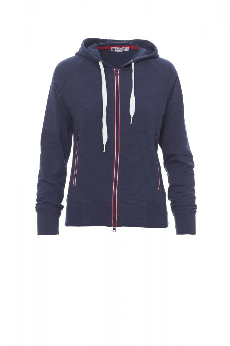 Felpa sfiancata da donna, zip intera in nylon a contrasto, con cappuccio e con coulisse in colore a contrasto, manica raglan, nastratura interno collo a contrasto, polsini e vita in rib elasticizzato e due tasche frontali con zip.