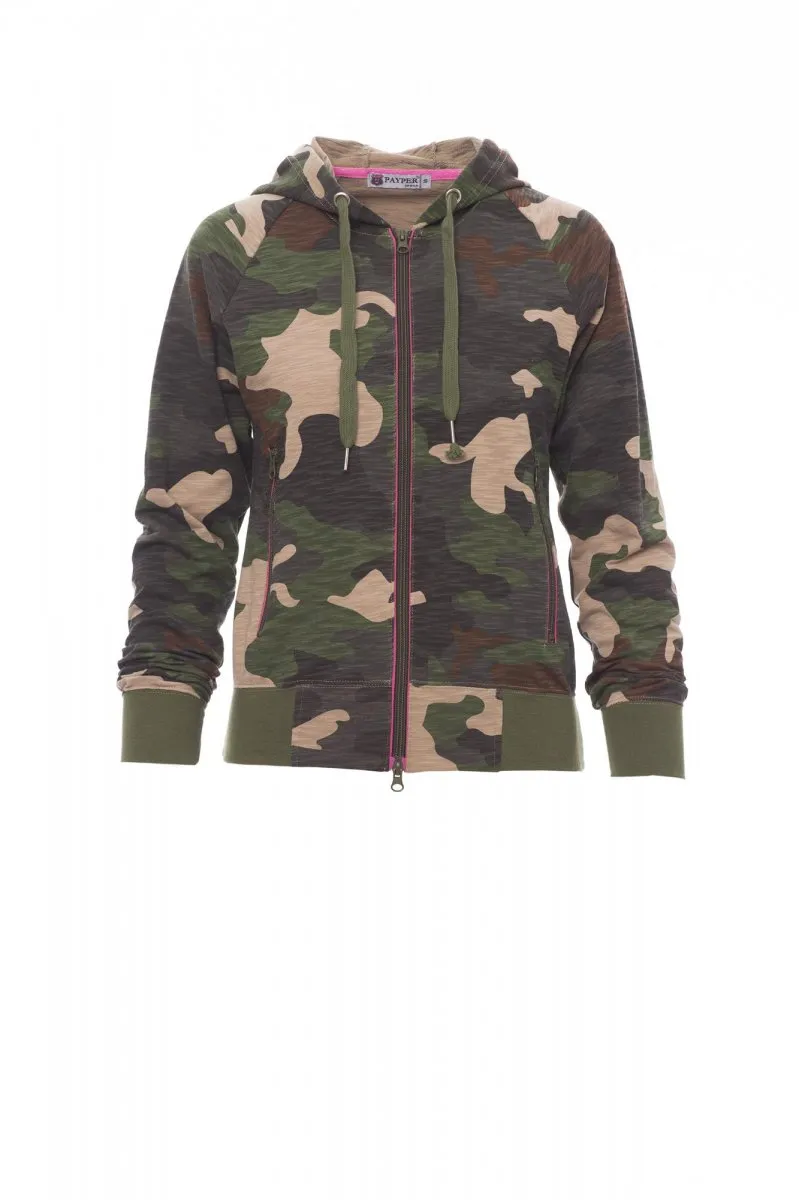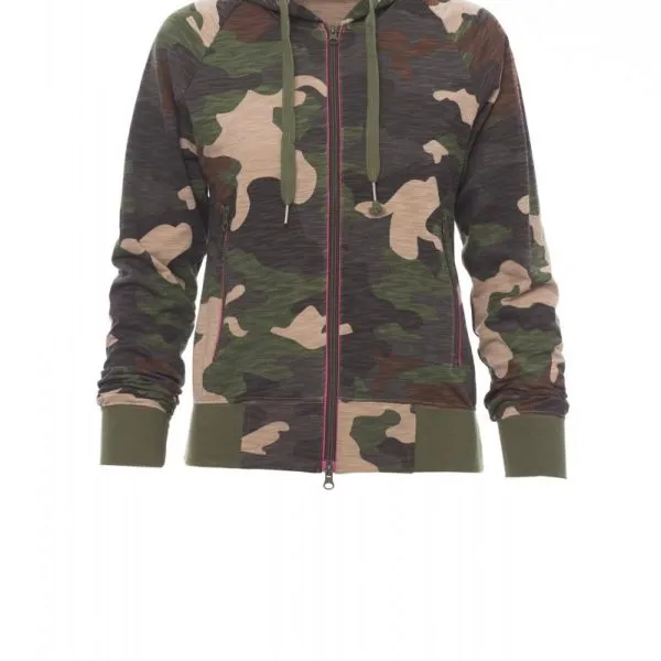 FREESTYLE LADY 000258-0016 Felpa sfiancata da donna, zip intera in nylon a contrasto, con cappuccio e con coulisse in colore a contrasto, manica raglan, nastratura interno collo a contrasto, polsini e vita in rib elasticizzato e due tasche frontali con zip. Composizione 80% COTONE + 20% POLIESTERE Peso 250 GR/MQ Taglie S-M-L-XL