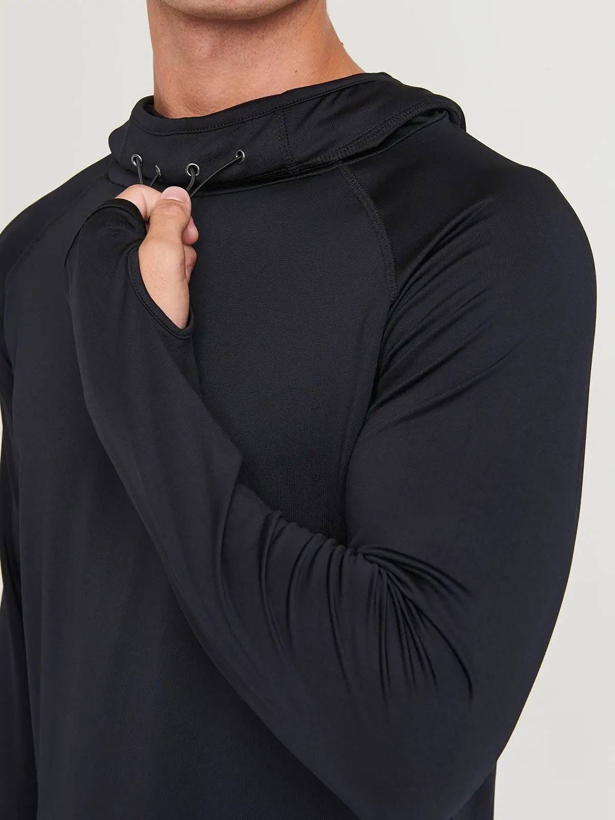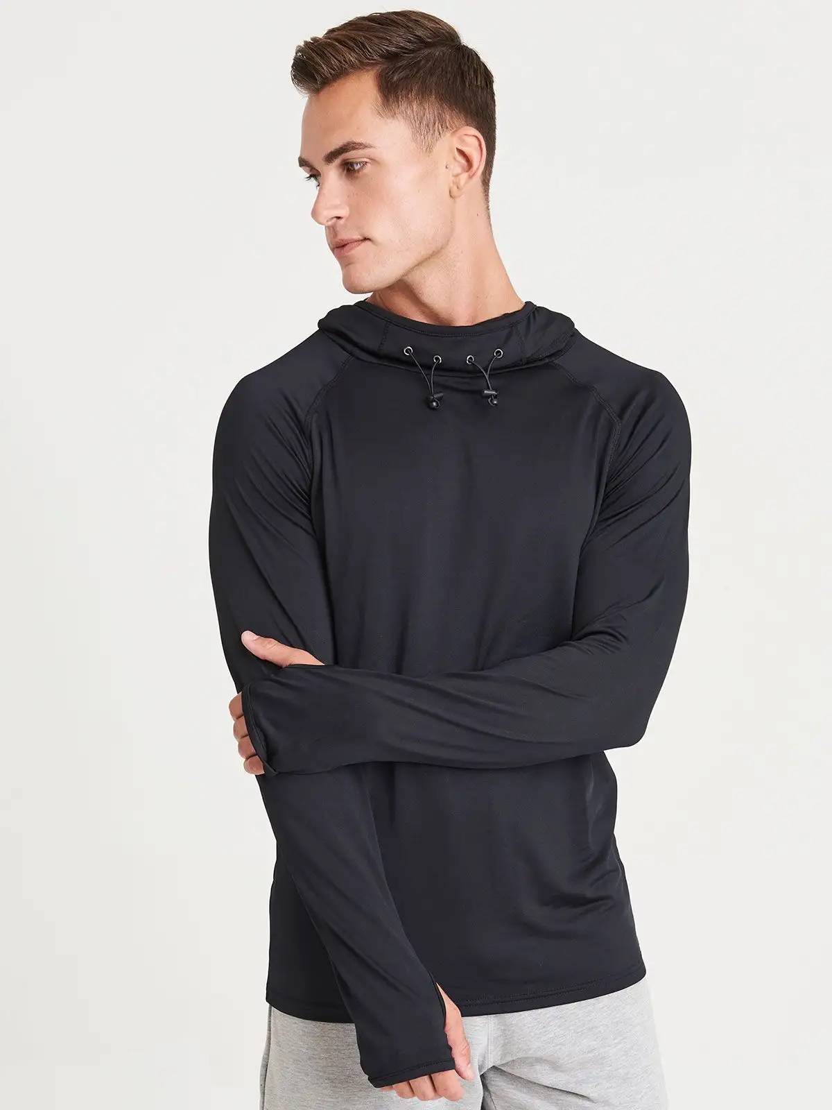 92% poliestere 8% elastan. Maglia da uomo con cappuccio, collo ad anello, maniche raglan, elementi riflettenti sul cappuccio, cuciture piatte, etichetta strappabile.