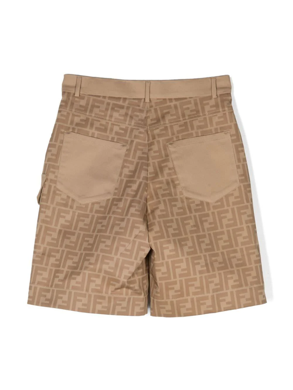 Bermuda in gabardina Fendi Kids, beige, stampa FF all-over, tasconi laterali, logo ricamato sulla tasca, passanti per cintura, chiusura con bottone.