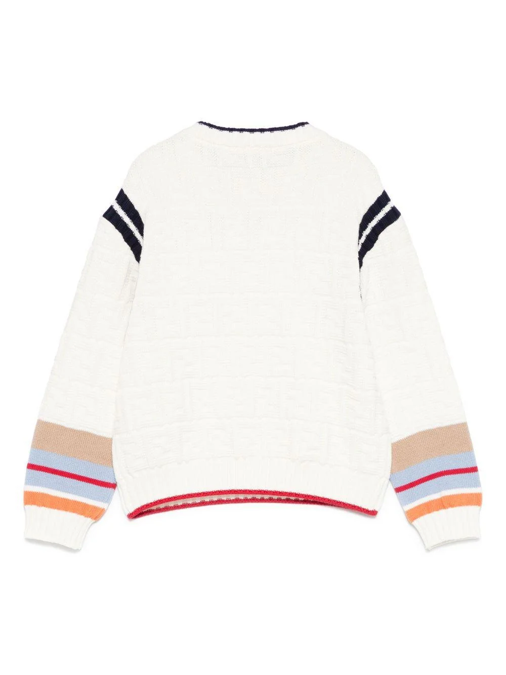 Maglione Fendi Kids, bianco, girocollo, maniche lunghe, polsini, bordi colorati, dettaglio con righe.