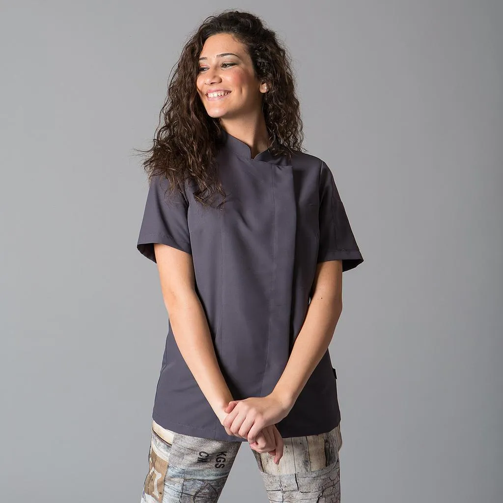 Questa giacca è realizzata su misura per combinare stile e funzionalità. Ha maniche corte e un colletto mao che le conferisce un aspetto elegante. Presenta inoltre una tasca sulla manica sinistra e una chiusura a doppio petto con bottoni a pressione nascosti. Il design semi-aderente, con pinces sul petto e pinces sulla schiena, assicura una vestibilità comoda e aderente.