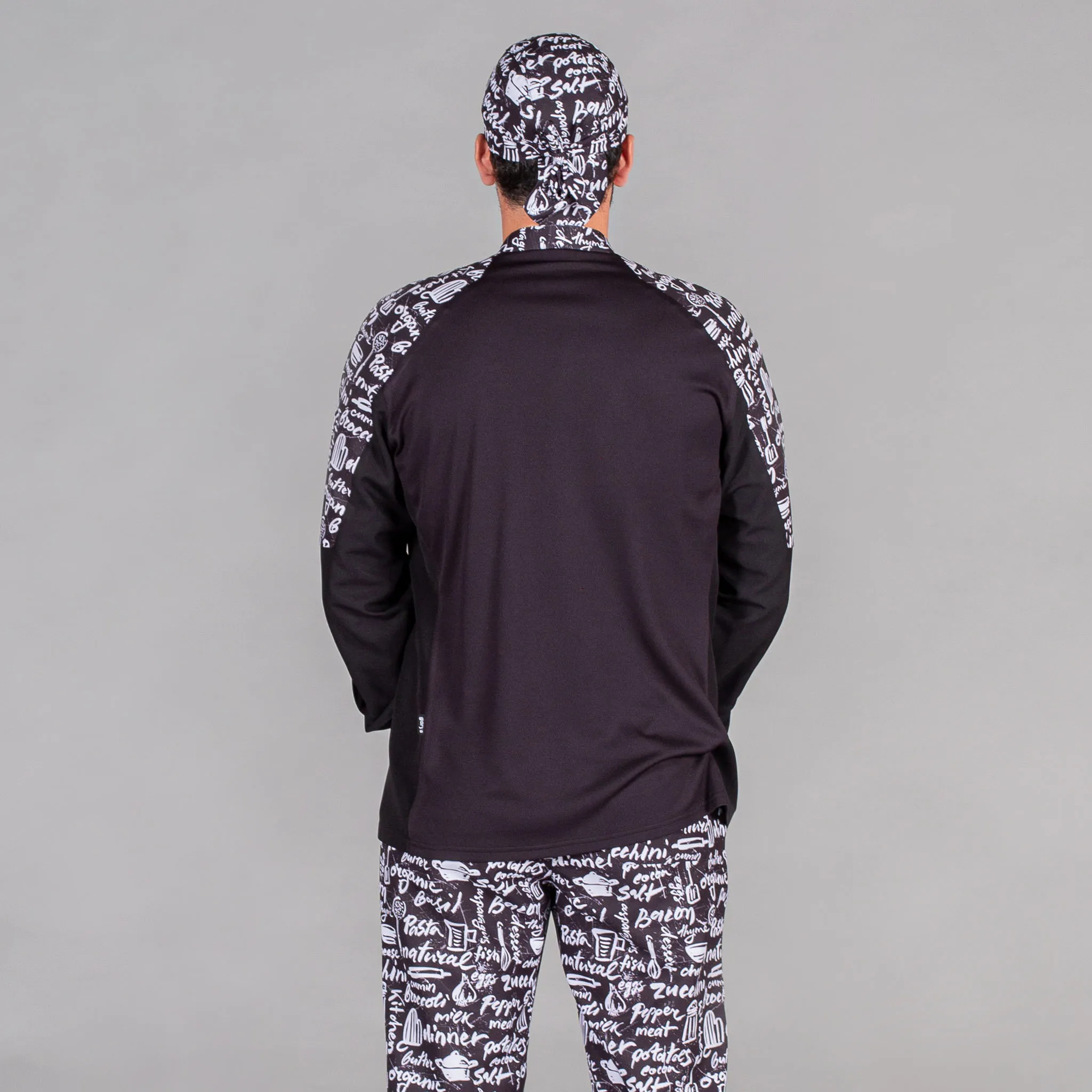 La giacca è dotata di una tasca sulla manica sinistra, che offre spazio per piccoli utensili o per gli strumenti di lavoro essenziali in cucina. La chiusura centrale con bottoni a pressione nascosti non solo aggiunge un tocco di stile, ma la rende anche facile da indossare in un ambiente di cucina affollato.