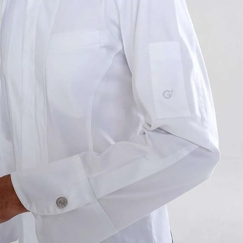 La giacca da chef Paul, della linea G’ Elegance, ha uno stile coreano dalle linee ordinate e dall’aspetto elegante. Nella collezione di quest’anno, presenta un’abbottonatura totalmente nascosta che ne impreziosisce lo stile. Il carattere di questo capo è arricchito anche dai polsini tipo camicia fermati da 2 automatici logati “G”. Ad impreziosire i dettagli, questi ultimi sono realizzati in zama nelle galvaniche color nickel e presentano un gioco di lucido e opaco sul logo. Le impunture di rifinitura sotto tutte a riva, per accennare appena i tagli presenti sul capo. Il taschino sul petto e il portapenne completano gli elementi della giacca. Questa giacca da lavoro ha una vestibilità slim fit. Realizzata in satin policotone elasticizzato, si presta a lavaggi alle alte temperature anche nella versione in nero, trattata secondo la tecnologia indantrene per garantire alte performance di manutenzione in tutte le tonalità di colore.