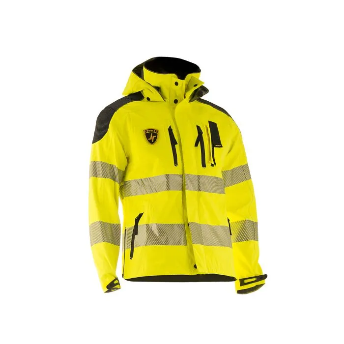 Giacca polifunzionale impermeabile,traspirante costruita in tessuto laminato PTFE tre strati con fodera integrata. Collo alto, cappuccio fisso a scomparsa, una tasca portaradio sul petto sinistro, due tasche verticali chiuse da cerniera acqua-stop, due tasche oblique sui fianchi e coulisse sul fondo regolabile a mezzo tiretto. Rinforzi antiabrasione sulle spalle e nastro rifrangente segmentato a tecnologia microsferica. All’interno cerniere verticali per inserimento Pile DOLOMITI cod. 629UT.