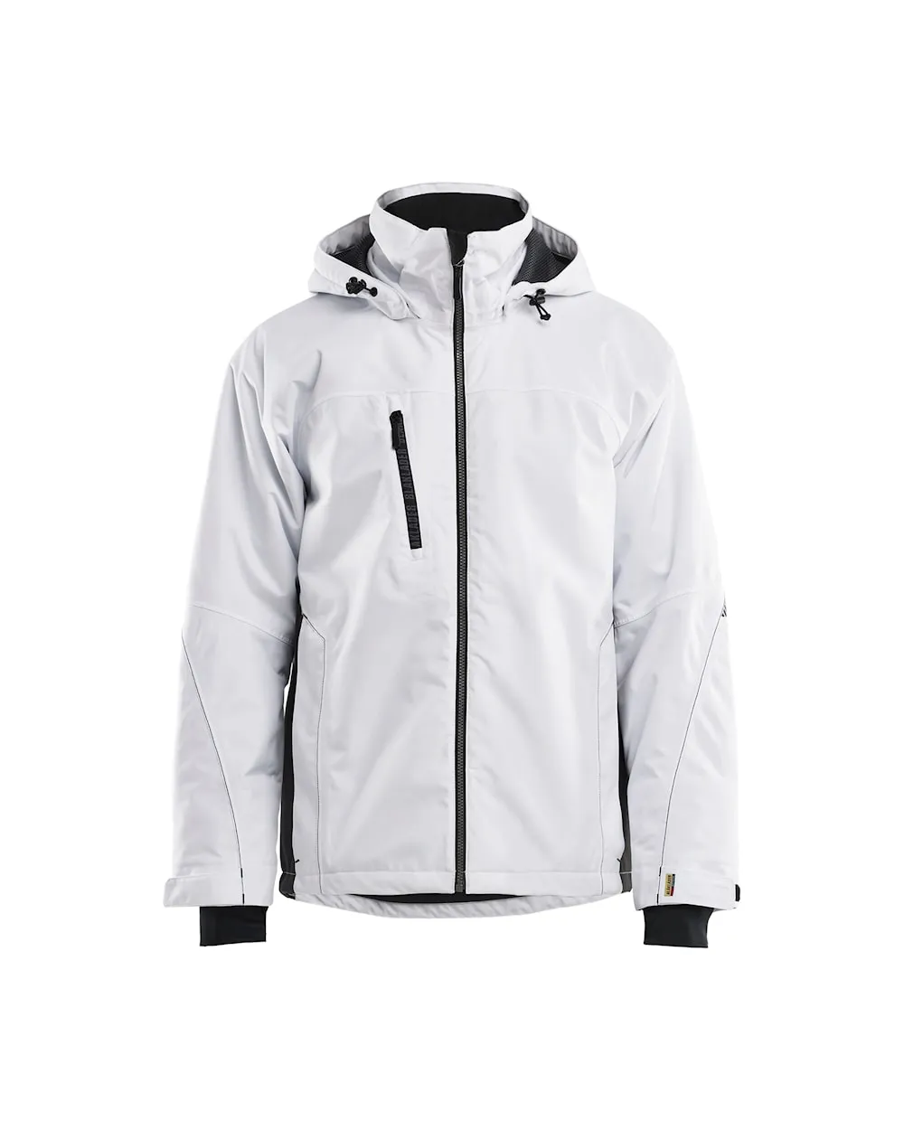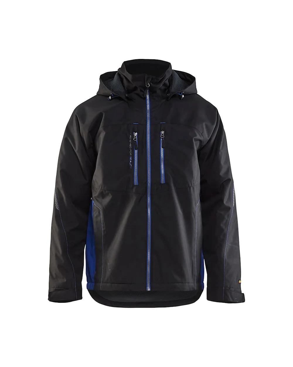 Giacca invernale foderata in maglia, perfetta da indossare in condizioni climatiche invernali. :Anti pioggia e vento, traspirante, dotata di cuciture termosaldate. Questa giacca bicolore con colori in contrasto ai lati è dotata di cappuccio staccabile e robusti dettagli rifrangenti. Col suo design funzionale è certificata EN 343 – abbigliamento di protezione da maltempo