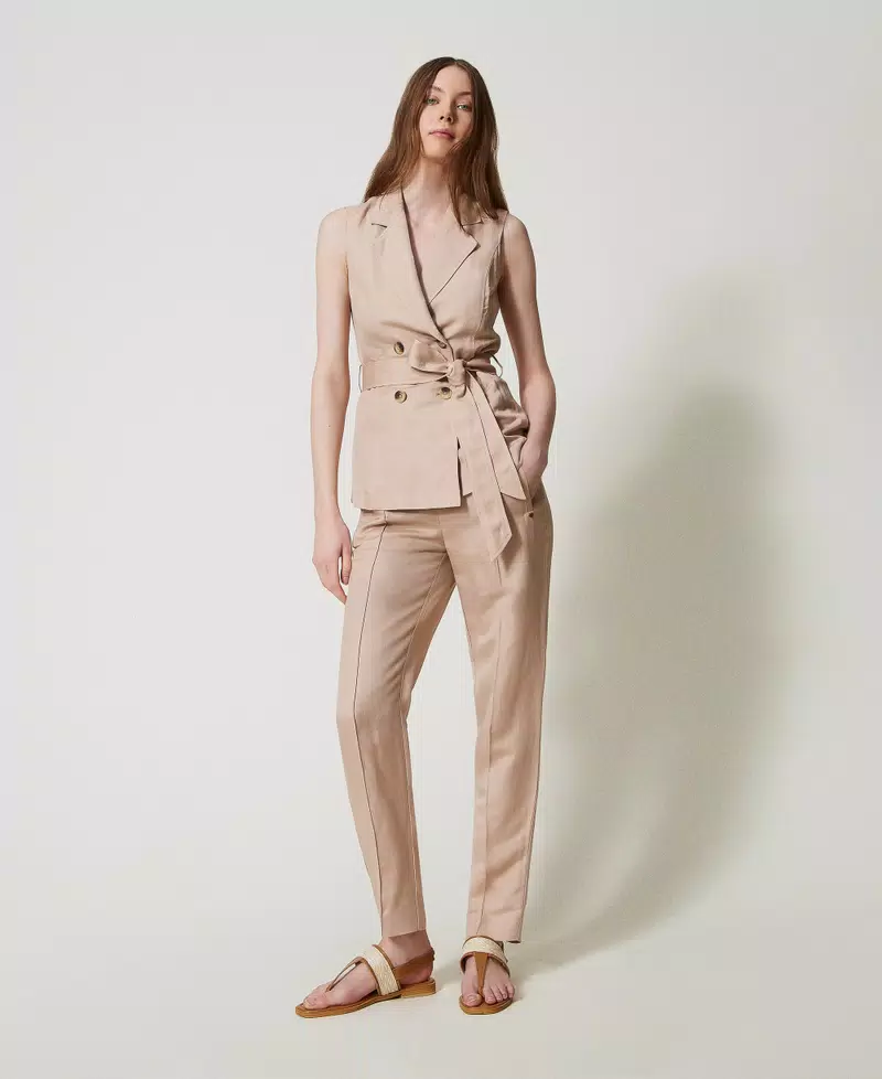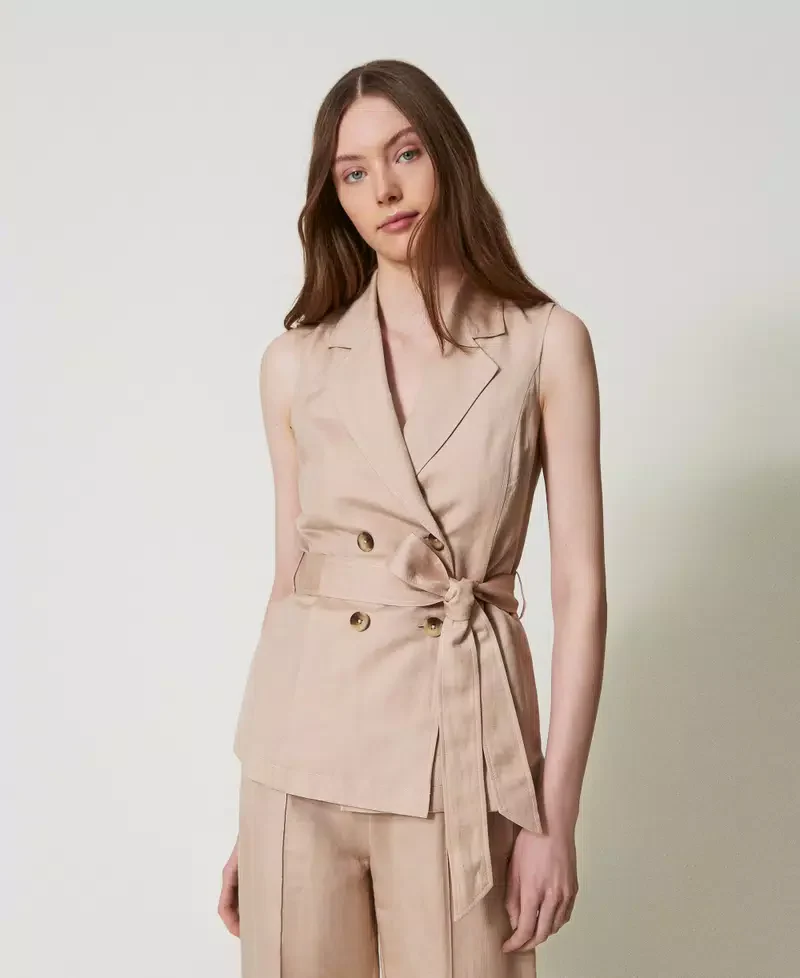 Gilet in misto lino e viscosa con cintura in coordinato abbinata. Ha collo con revers, impunture ribattute per le cuciture davanti e dietro, chiusura doppiopetto con bottoni effetto corno e contro-bottone interno, fodera in mussola di cotone, logo a cuore in metallo sul retro.