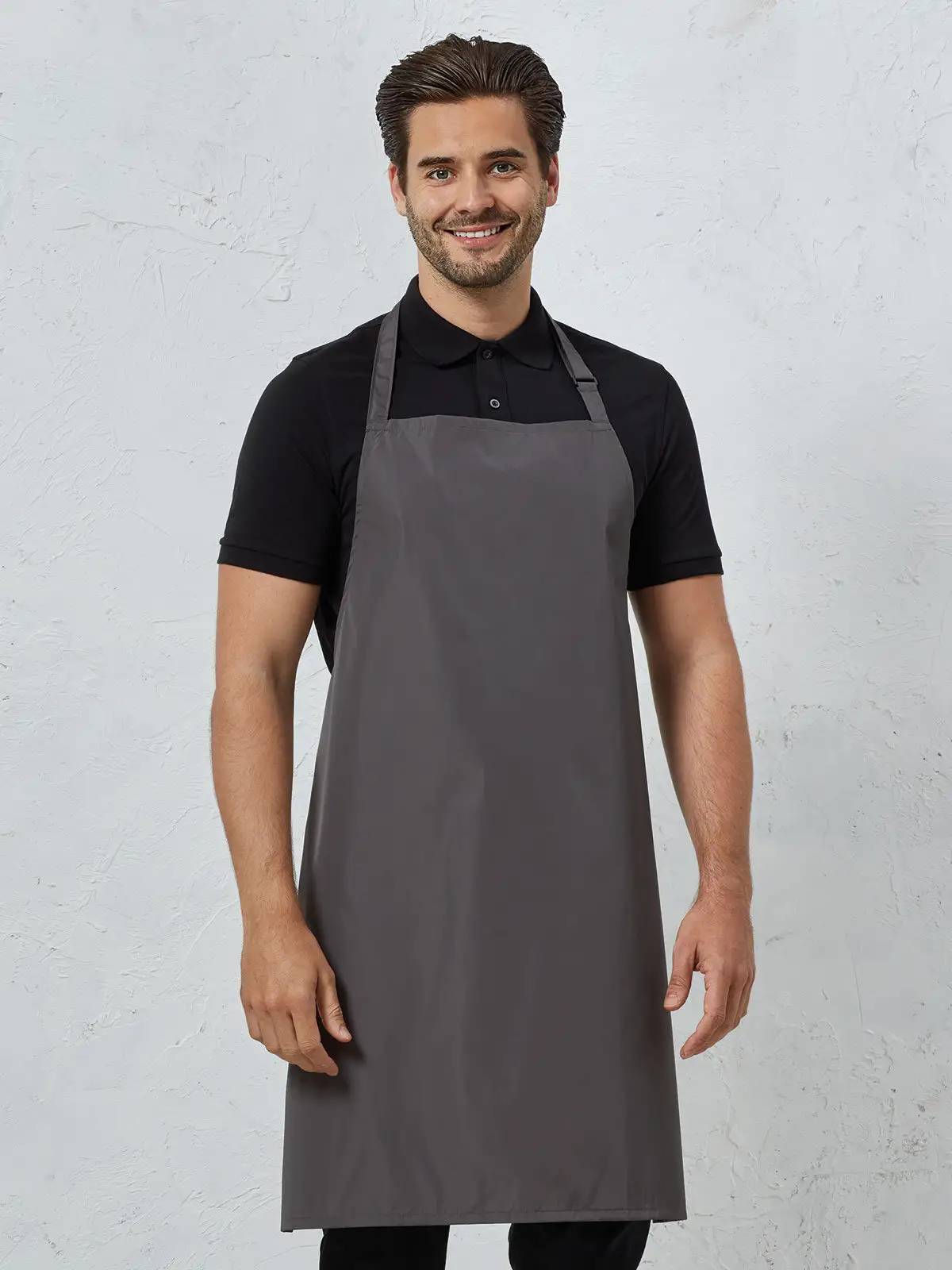 100% poliestere rivestito in poliuretano. Grembiule taglia unica in tessuto impermeabile con fibbia regolabile sul collo e allacciatura posteriore con lacci in tessuto da 90 cm.