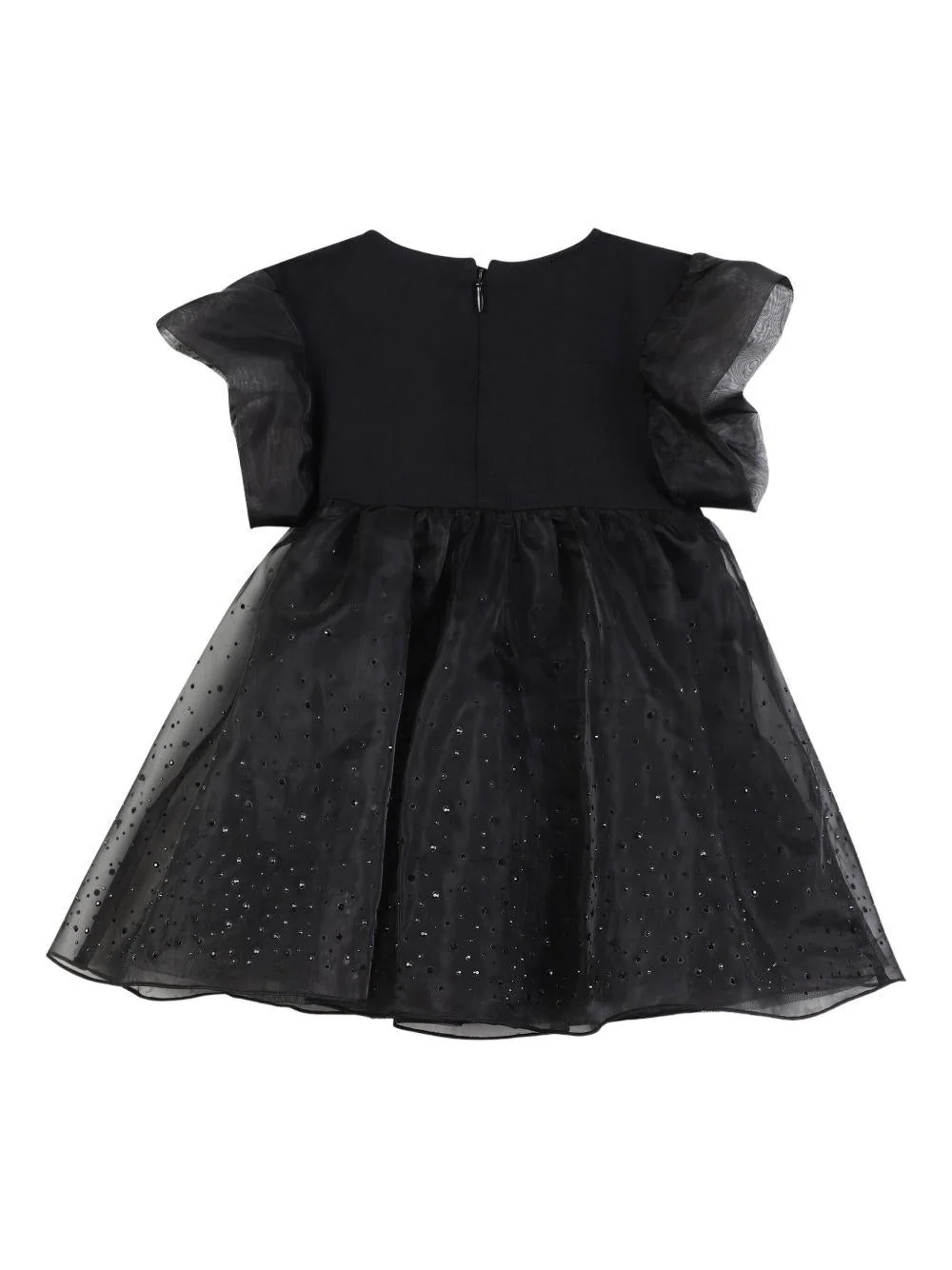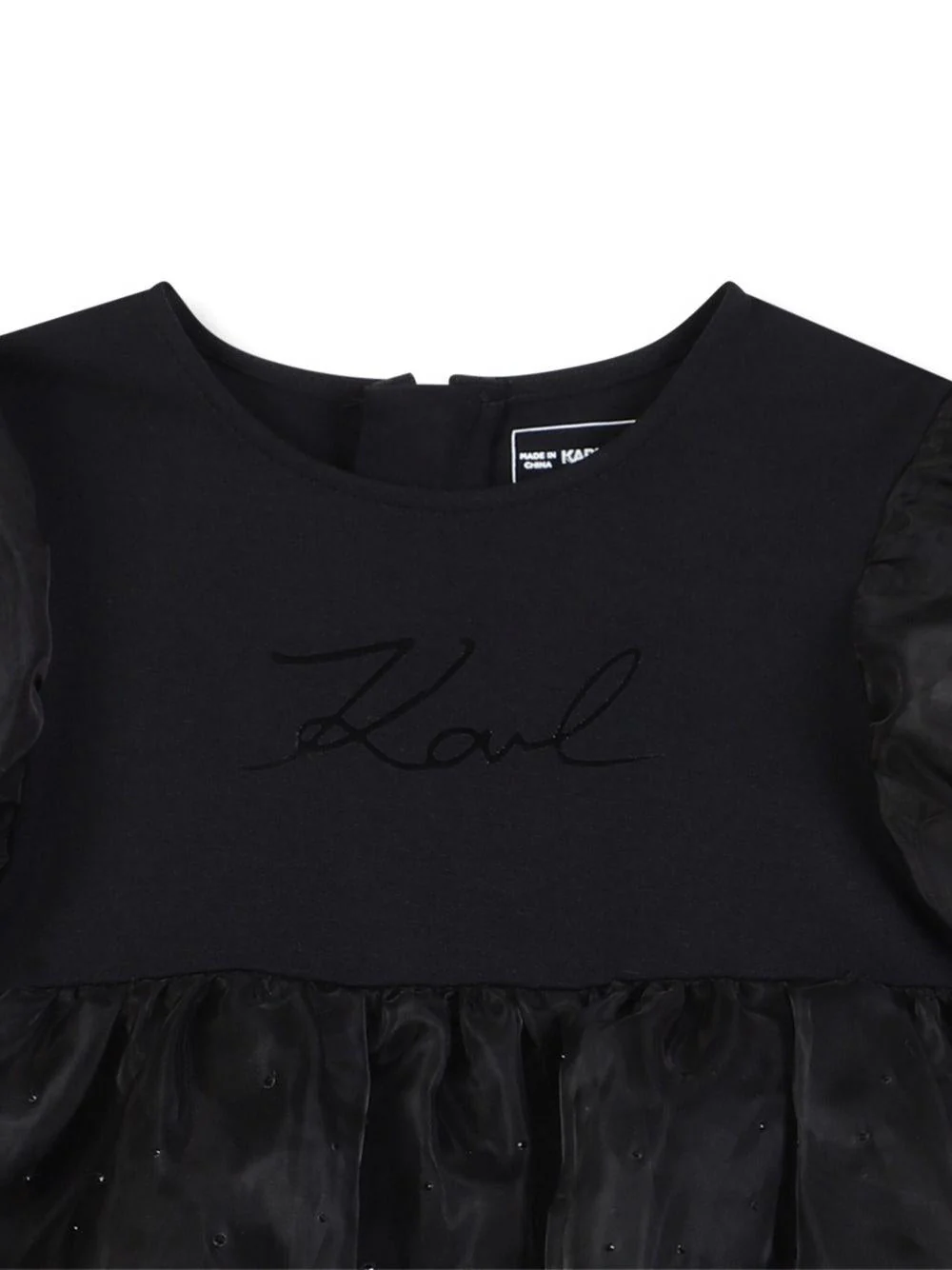 Abito Karl Lagerfeld Kids, nero, design a strati, maniche corte con tulle, girocollo, gonna a strati con tulle superiore impreziosita da strass, logo sul davanti, chiusura con zip sul retro.