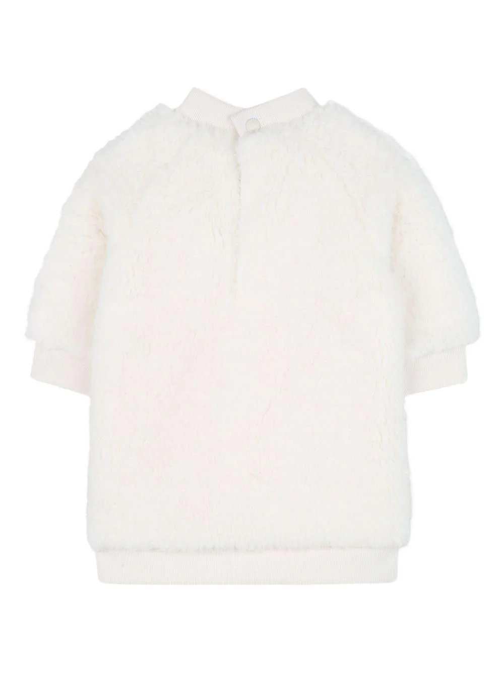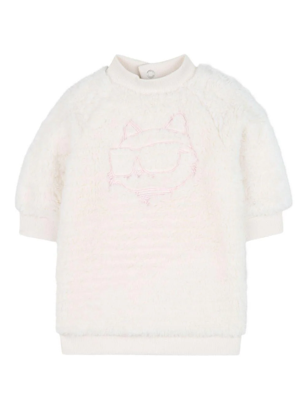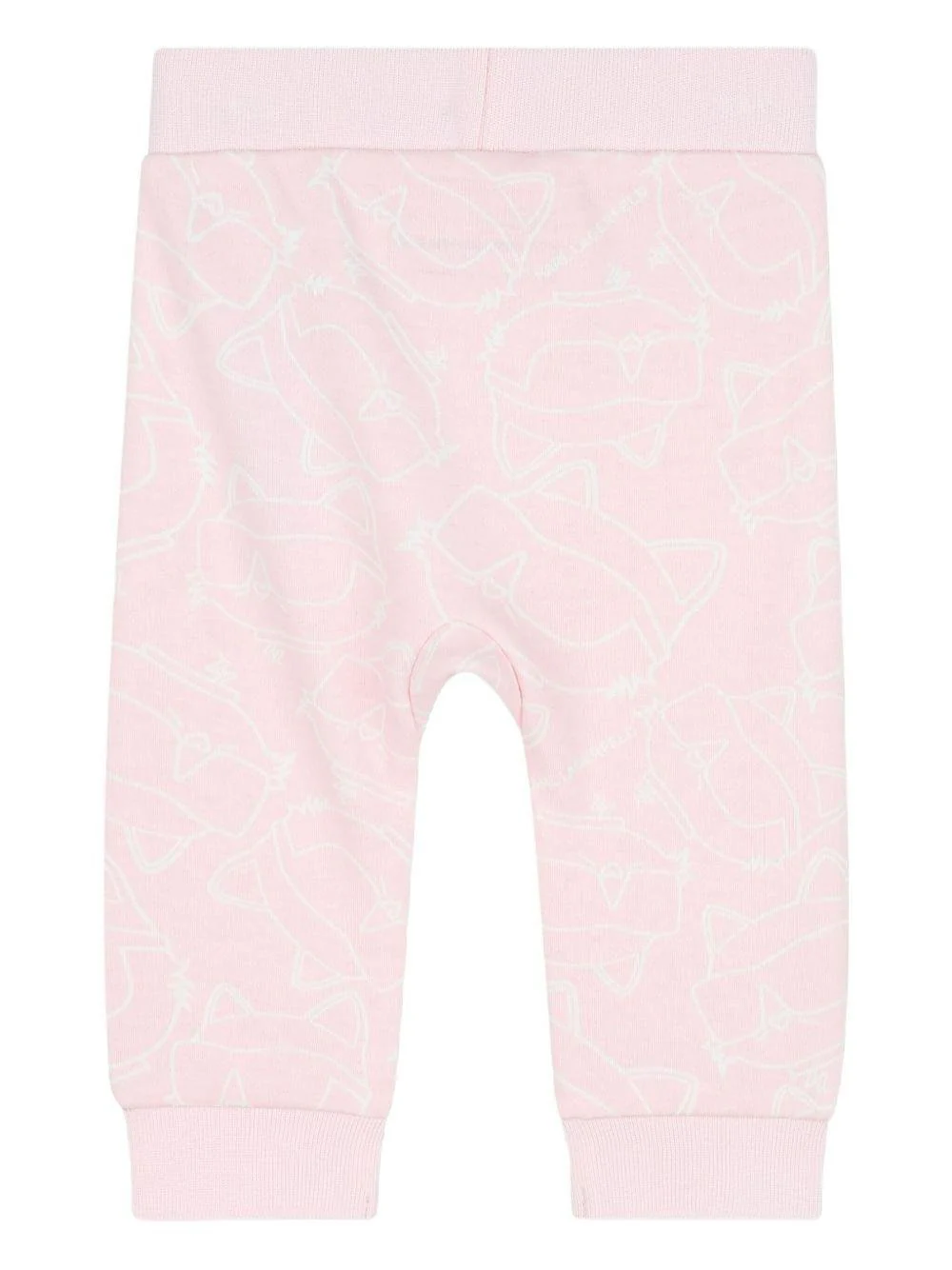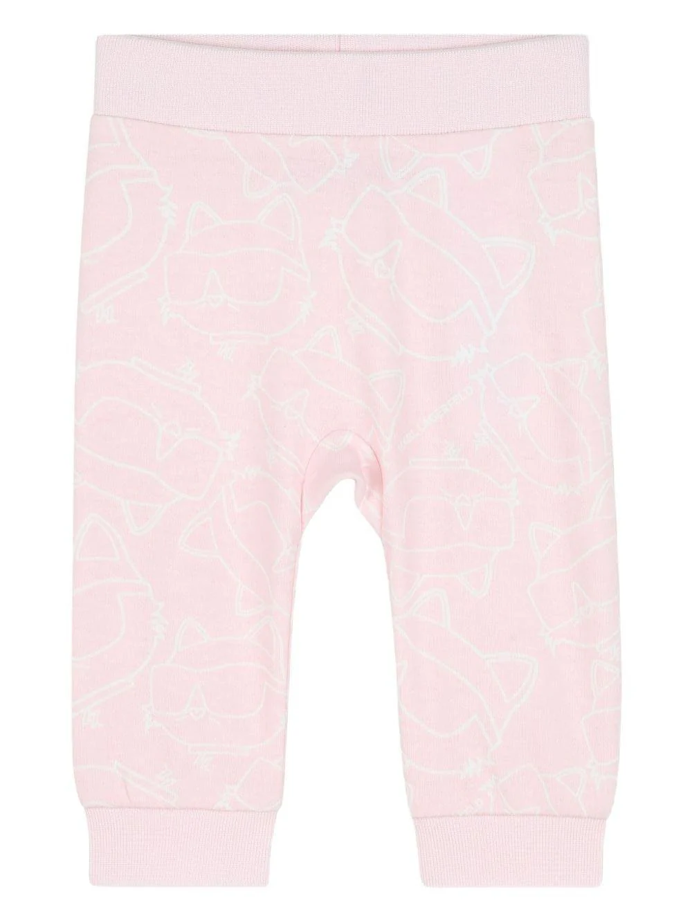 Completo Karl Lagerfeld Kids, bianco/rosa, abito con design pecorella, girocollo, polsini, gatto a contrasto sul davanti, chiusura con bottoni sul retro, pantaloni con vita elasticizzata, motivo stampa gatti.