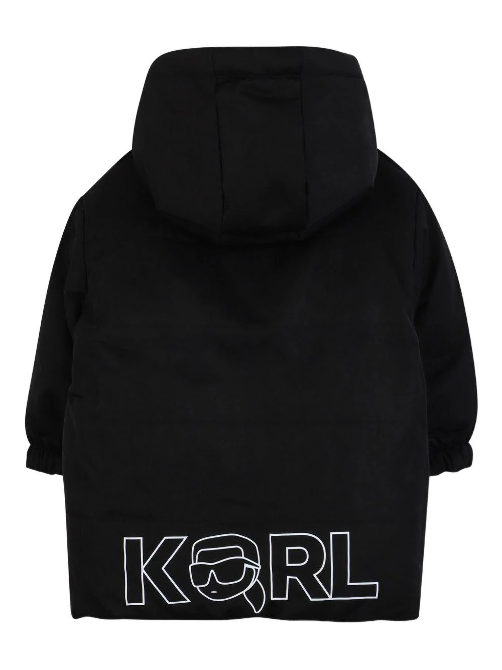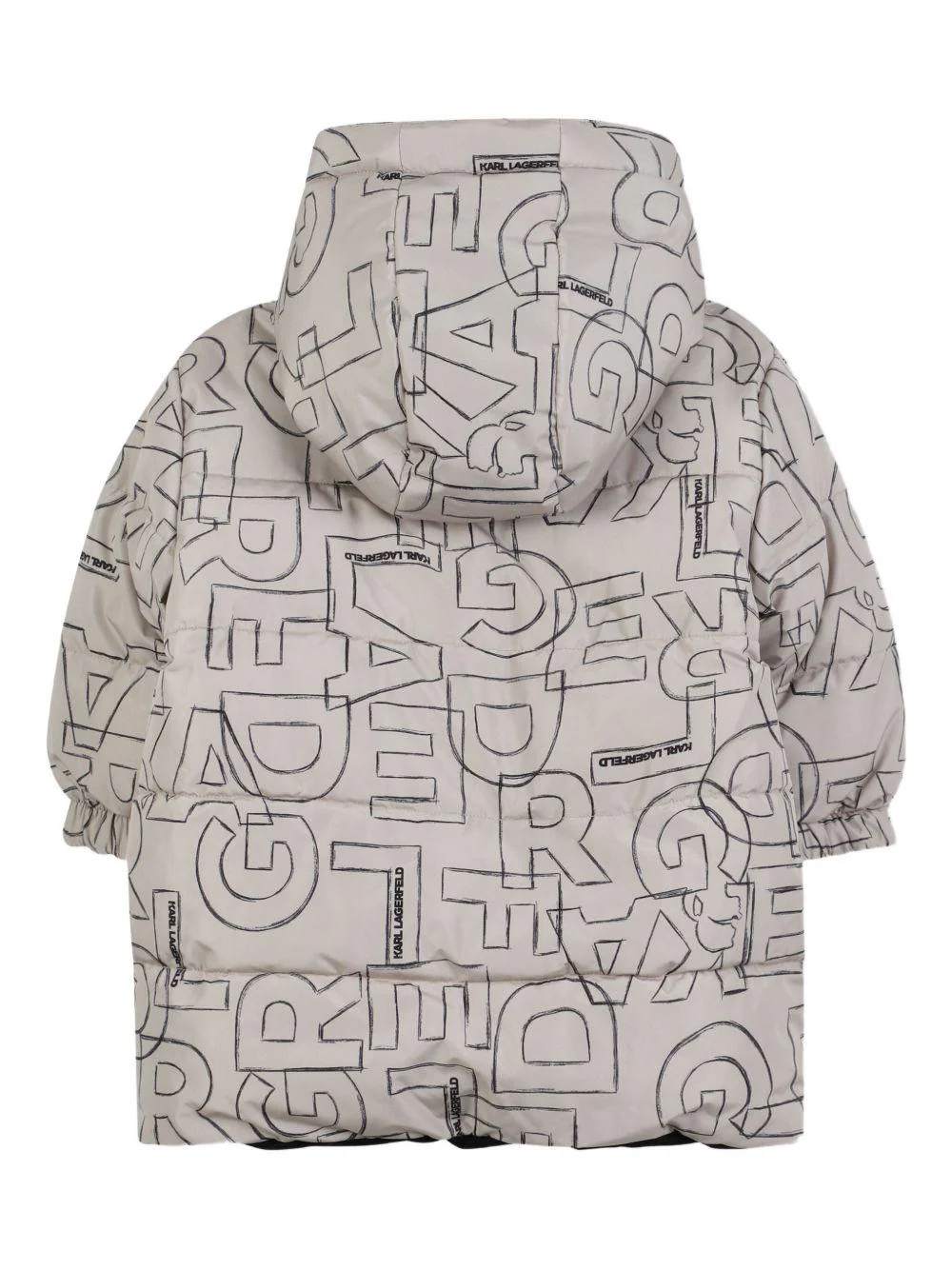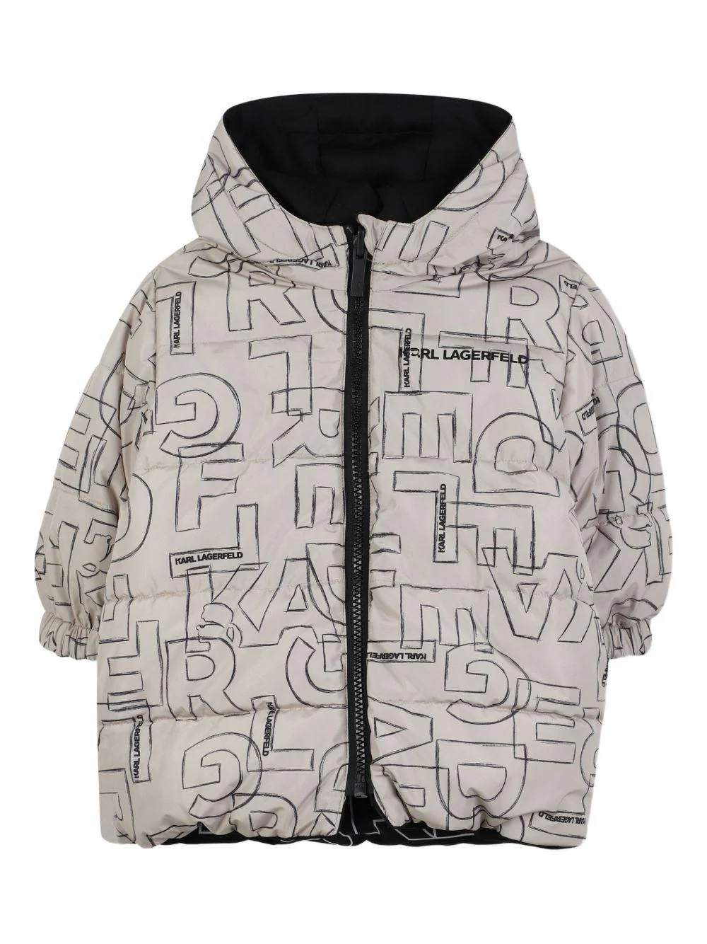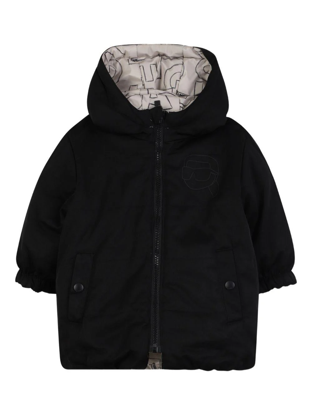 Giubbino reversibile Karl Lagerfeld Kids, beige/nero, cappuccio, da un lato con motivo logato, polsini, stampa logo sul petto, chiusura con zip, dall’altro lato due tasche con bottone, polsini, stampa logo sul retro, logo sul petto, chiusura con zip.