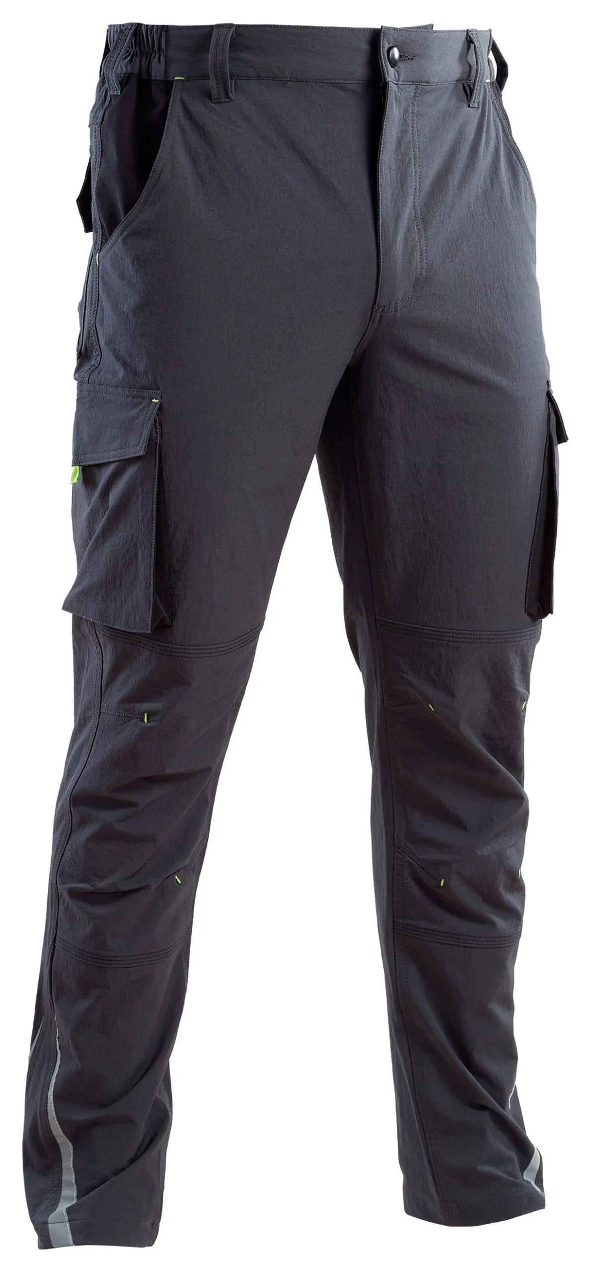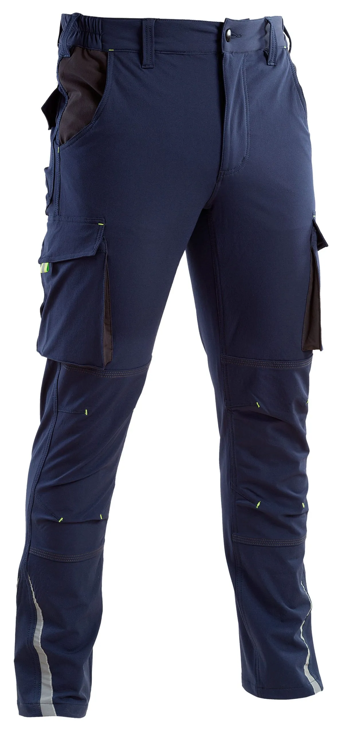 Norma di riferimento: UNI EN 13688 Tessuto: 90% nylon/10% spandex , peso tessuto 260 gr/mq Fabric: 90% nylon/10% spandex, weight 260 gsm Taglie disponibili: dalla S alla 3XL Colori disponibili: 12 blu/grigio, 50 grigio/nero Pantalone superstretch con elastici ai fianchi, dettagli rifrangenti sul fondo gamba, travette in tinta giallo fluo, ginocchia preformate, chiusura centrale con cerniera e bottone, 2 tasche anteriori a filetto, doppio tascone laterale con pattina chiusa da velcro, 2 tasche posteriori chiuse con pattina e velcro, doppie cuciture nei punti di maggiore sforzo