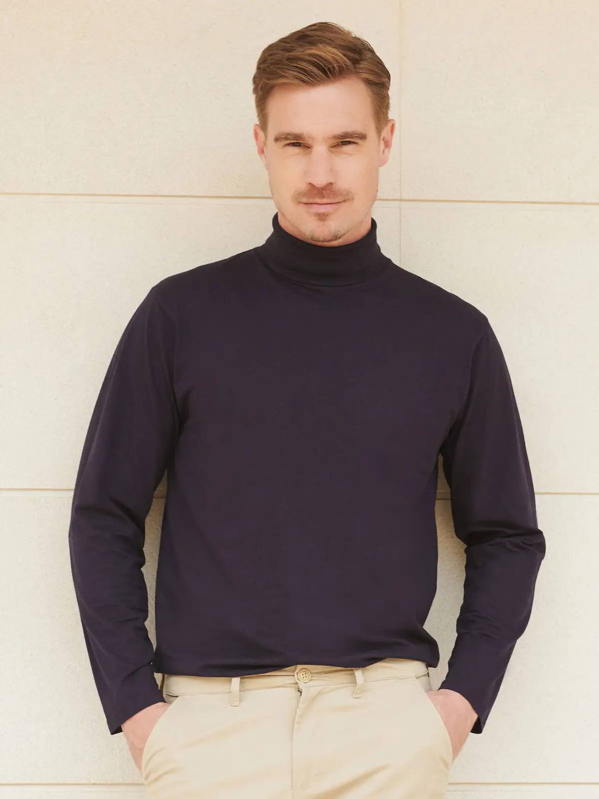 96% cotone 4% elastan. Maglia a maniche lunghe con collo alto in jersey elasticizzato, cucitura a doppio ago, polsini con orlo.