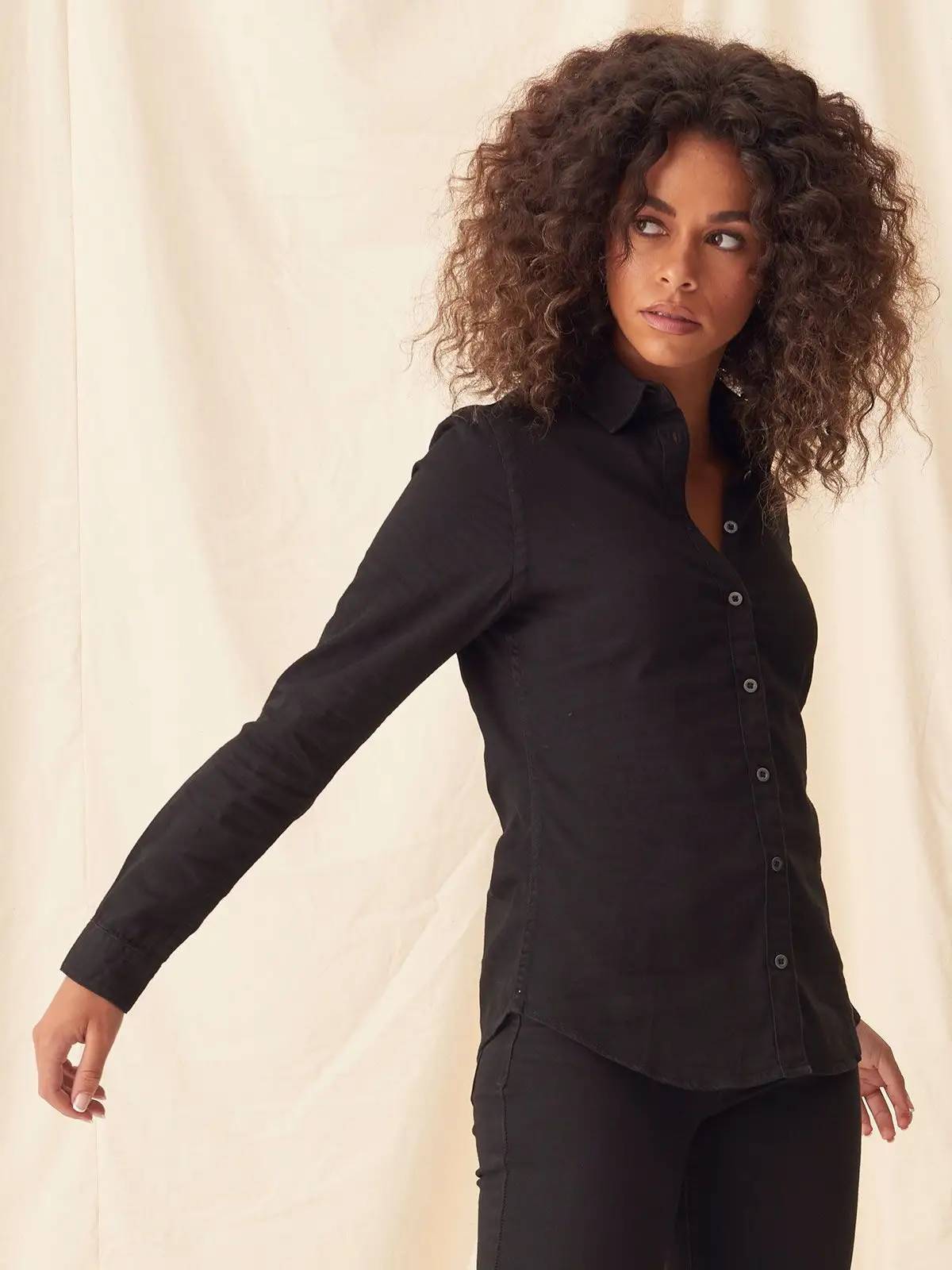 100% cotone. Camicia donna manica lunga senza tasche, leggermente sfiancata ai lati. Cuciture laterali in contrasto, cuciture in contrasto su maniche, colletto e polsini. Polsini con due bottoni ciascuno, ideale per la personalizzazione.