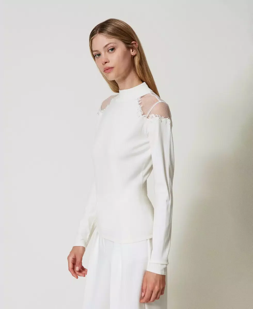 Maglia in viscosa stretch con inserti in tulle see-through profilati da ricami floreali tono su tono. Ha collo a lupetto, maniche lunghe, linea fitted. Colore: Avorio Tessuto: 72% Viscosa 28% Poliestere