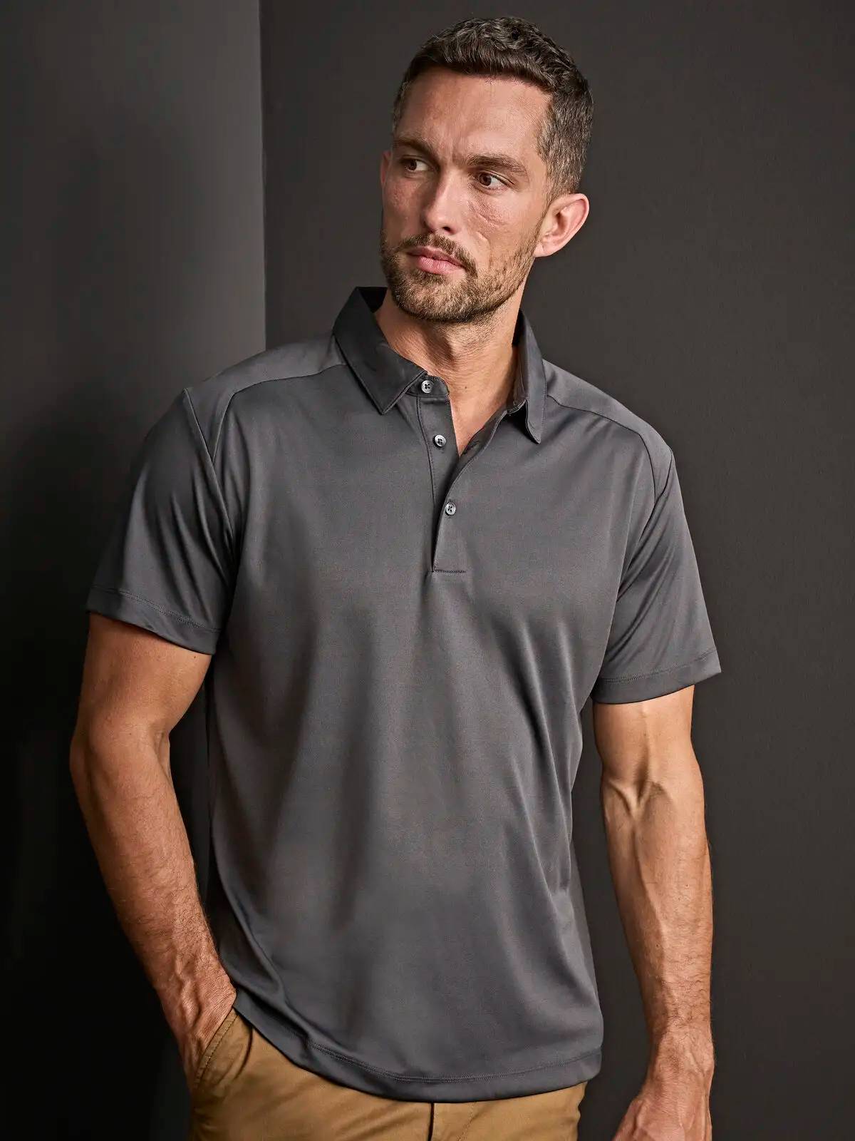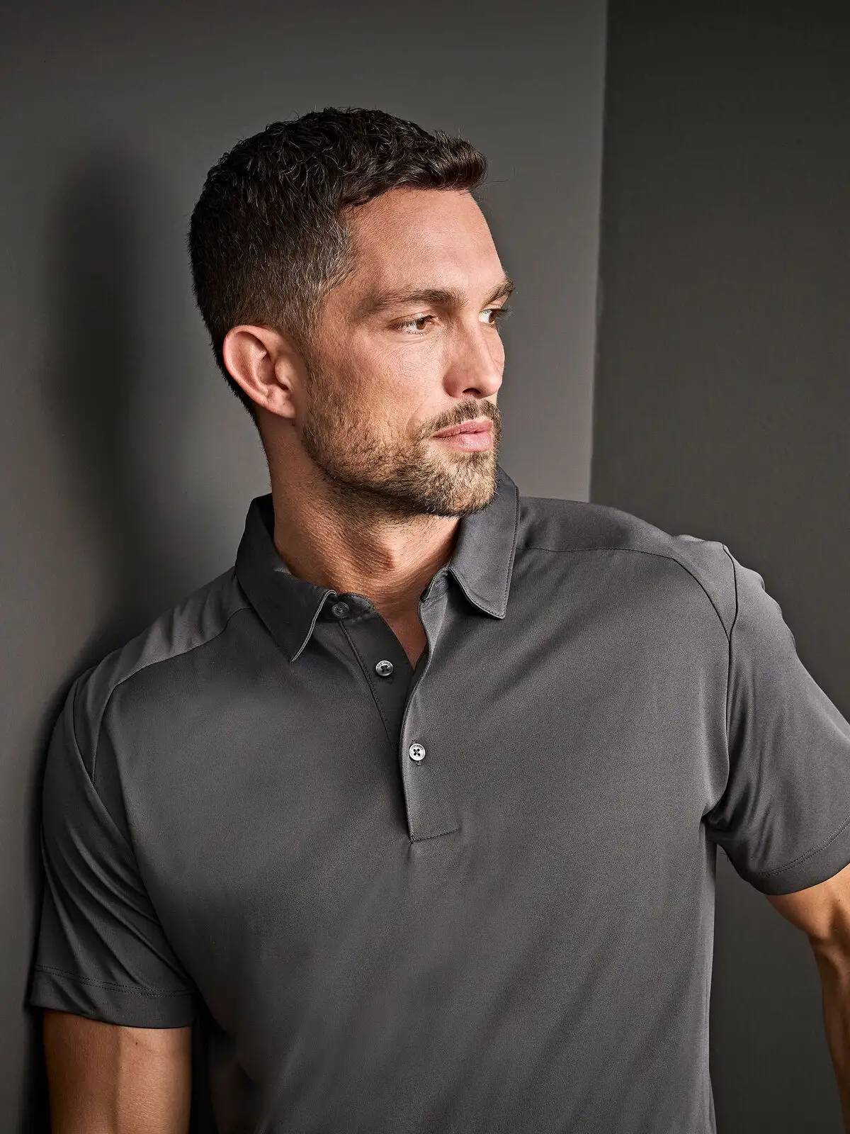 100% poliestere. Polo da uomo in tessuto leggero, look sportivo e moderno, colletto foderato in tessuto, bottoni a contrasto color antracite, rifiniture del bordo in tessuto anti-umidità.