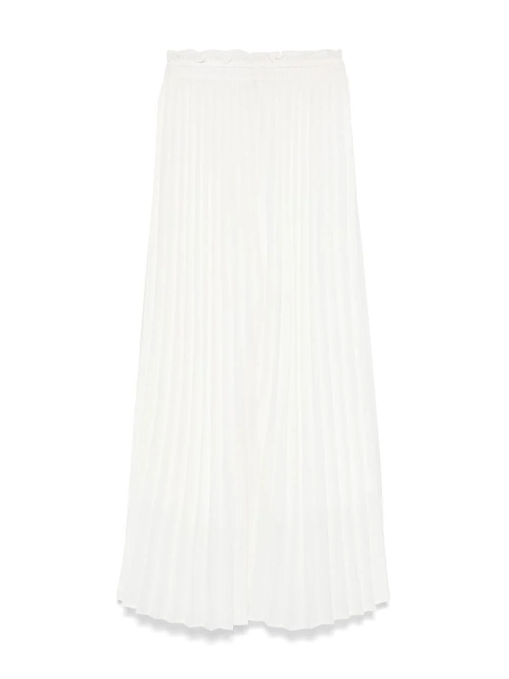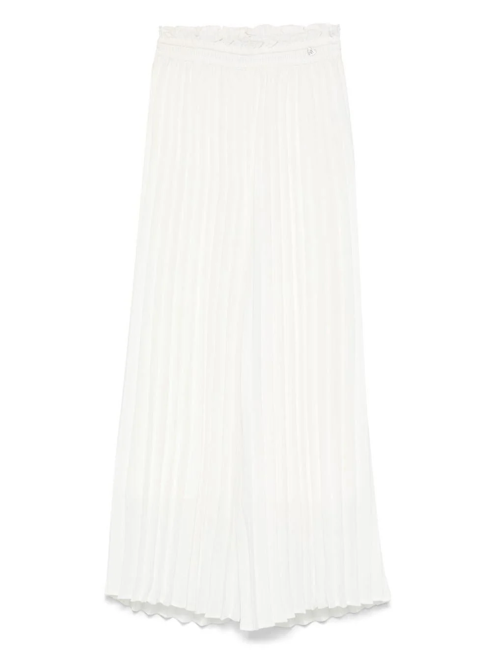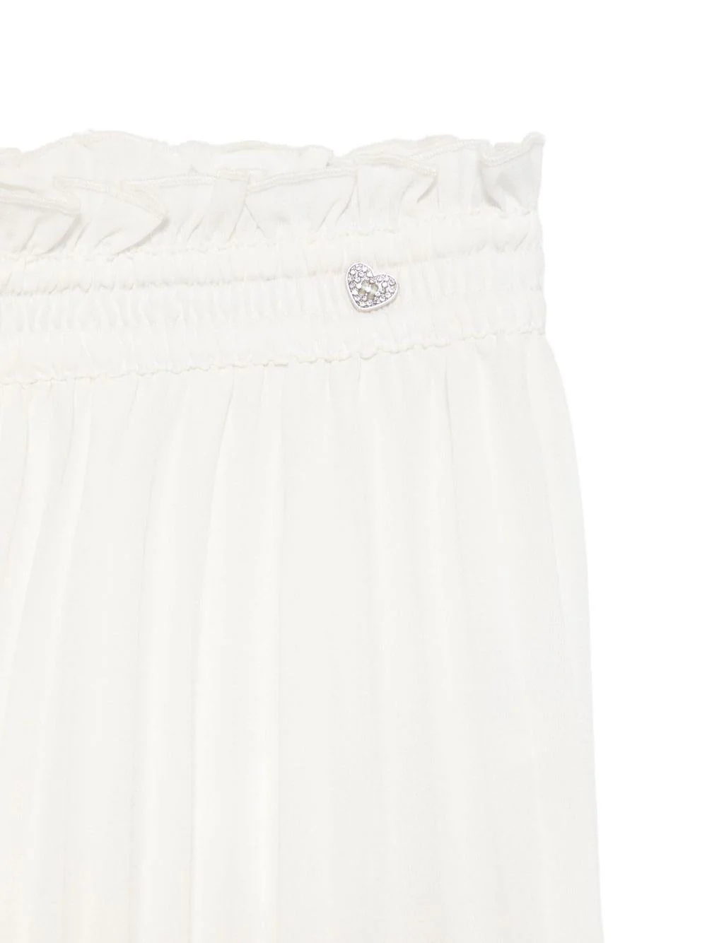 Pantaloni plissé Monnalisa, bianco, effetto crepe, vita elasticizzata, placchetta con logo, gamba ampia, modello plissettato.