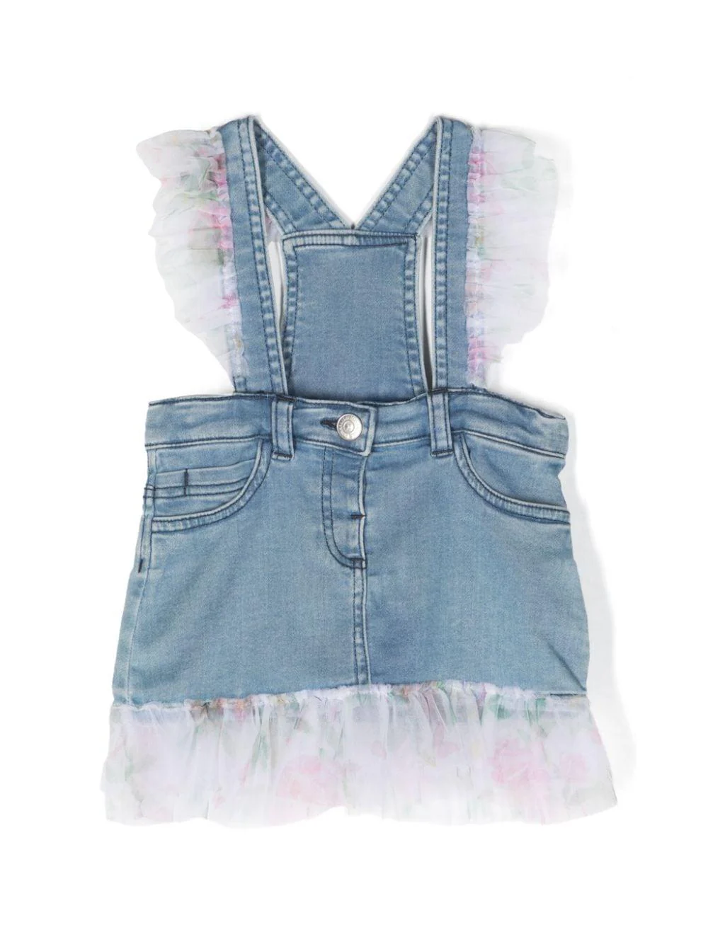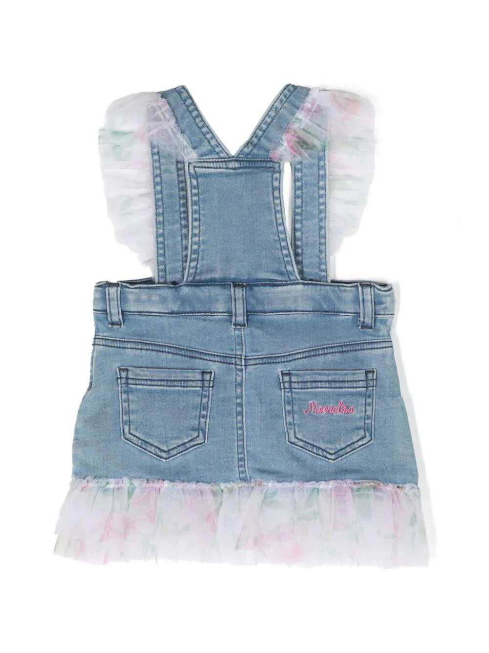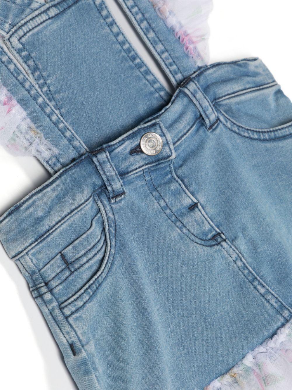 Salopette in denim Monnalisa, dettagli in tulle, spalline, chiusura con bottone, cinque tasche.