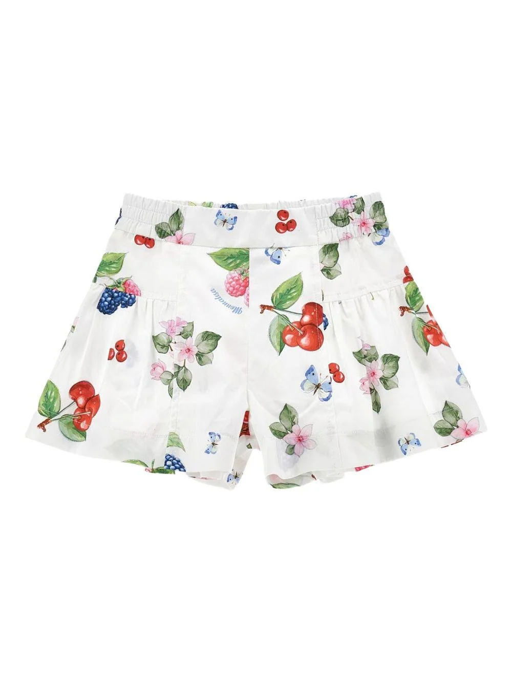 Shorts con stampa Monnalisa, bianco, stampa con frutta, vita elasticizzata, dettagli plissettati.