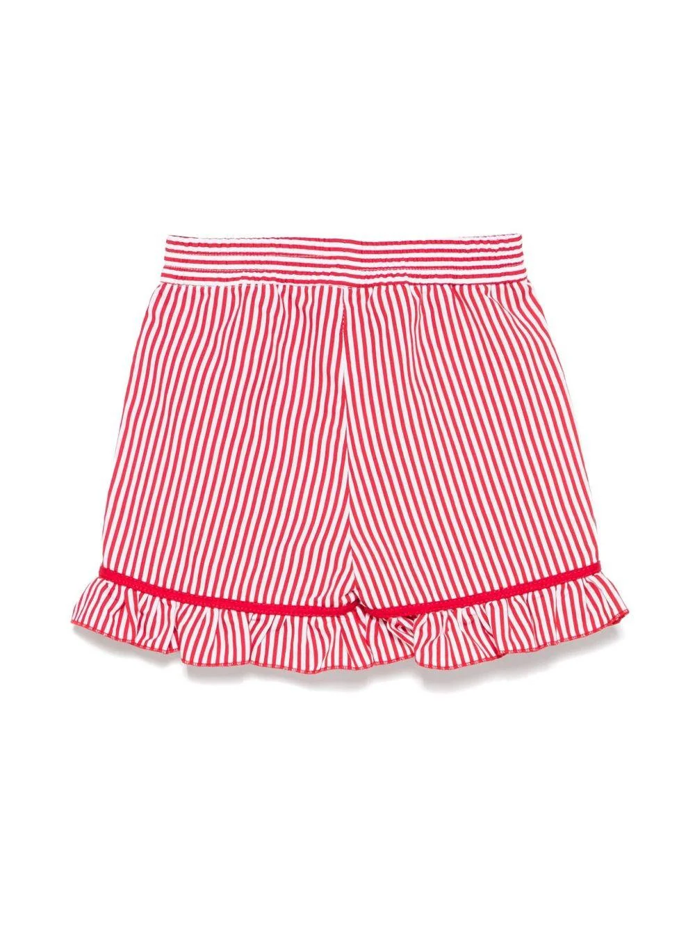 Shorts rigati Monnalisa, bianco/rosso, vita elasticizzata, fantasia a righe verticali, fioccheti e rouches sull’orlo. Made in Italy Composizioneviscosa 90%, poliestere 10%