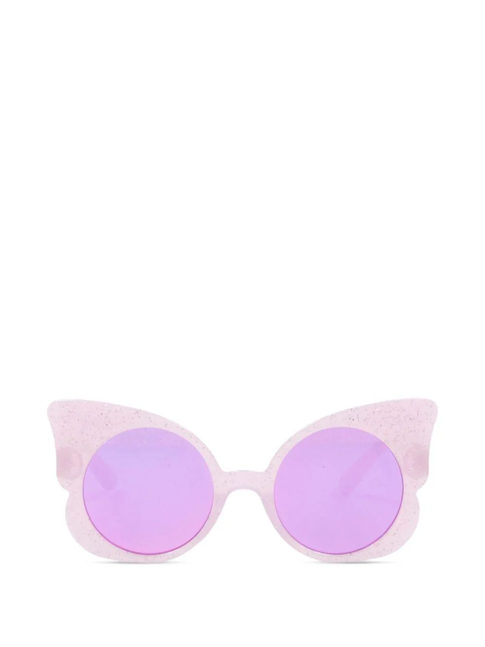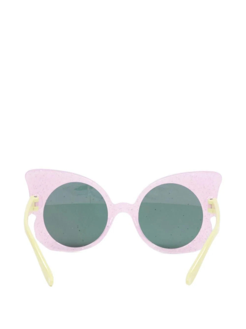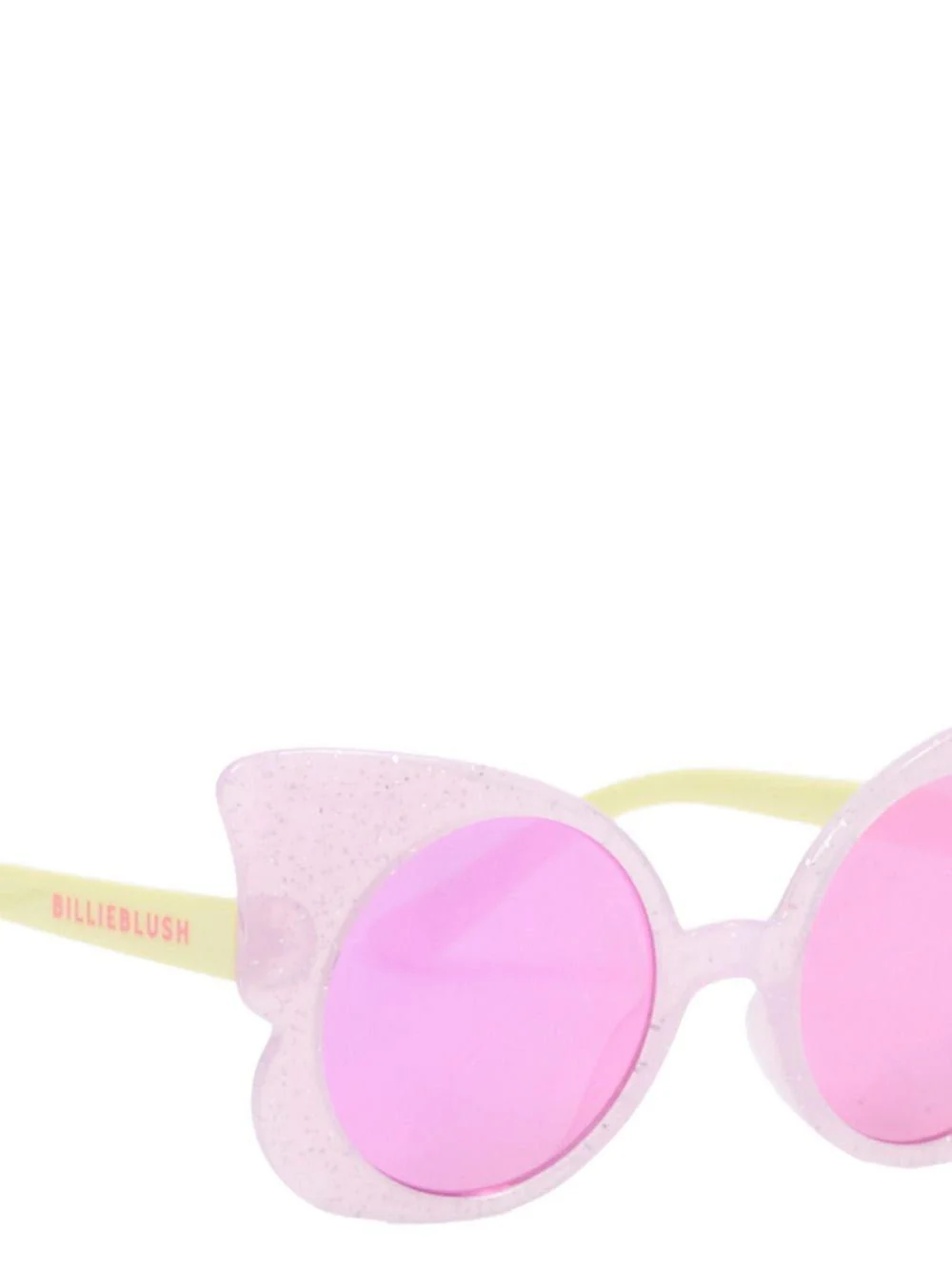 Occhiali da sole Billieblush, rosa, montatura a forma di occhi di gatto, effetto glitterato, lenti rotonde colorate, astuccio portaocchiali.