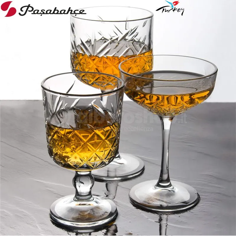 Calice Cocktail/Long Drink TIMELESS VINTAGE by PASABAHCE. Capacità 500 ml 16 3/4 oz. Altezza 198 mm – 7 3/4 . Diametro 102 mm 4 . Vetro trasparente, brillante e molto resistente con un elegante decoro geometrico. Confezione in scatola da 12 pezzi.