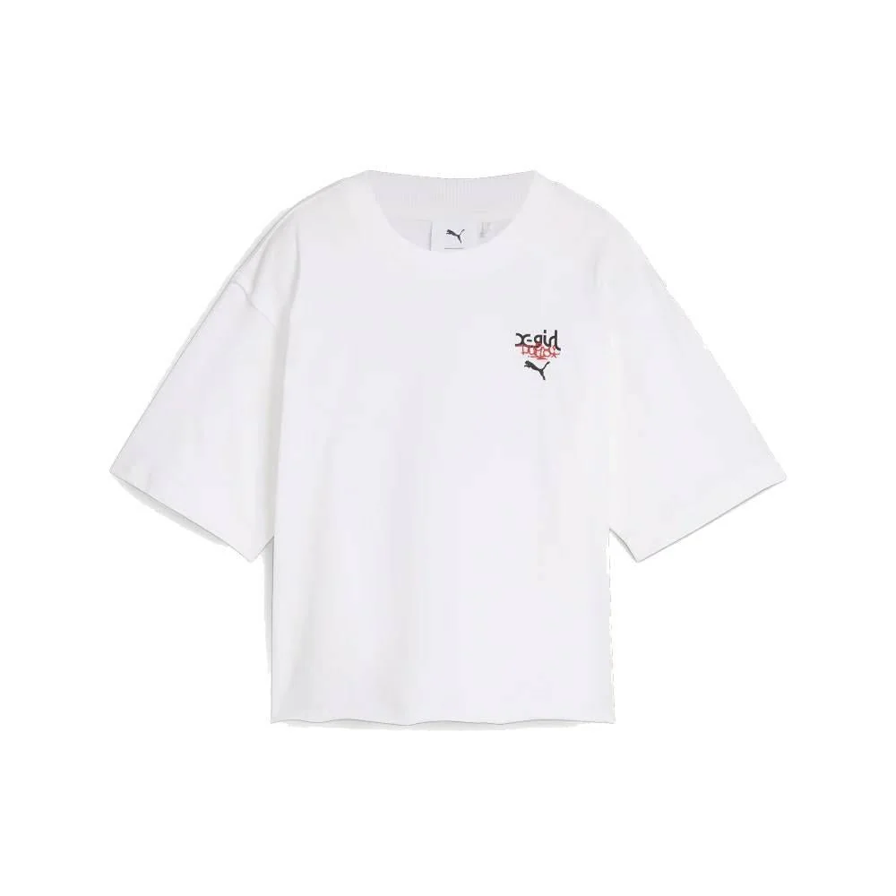 T-shirt con stampa Puma Kids, bianco, collaborazione con X-Girl, maniche corte con spalle scese, girocollo, logo sul petto, maxi stampa sul retro.