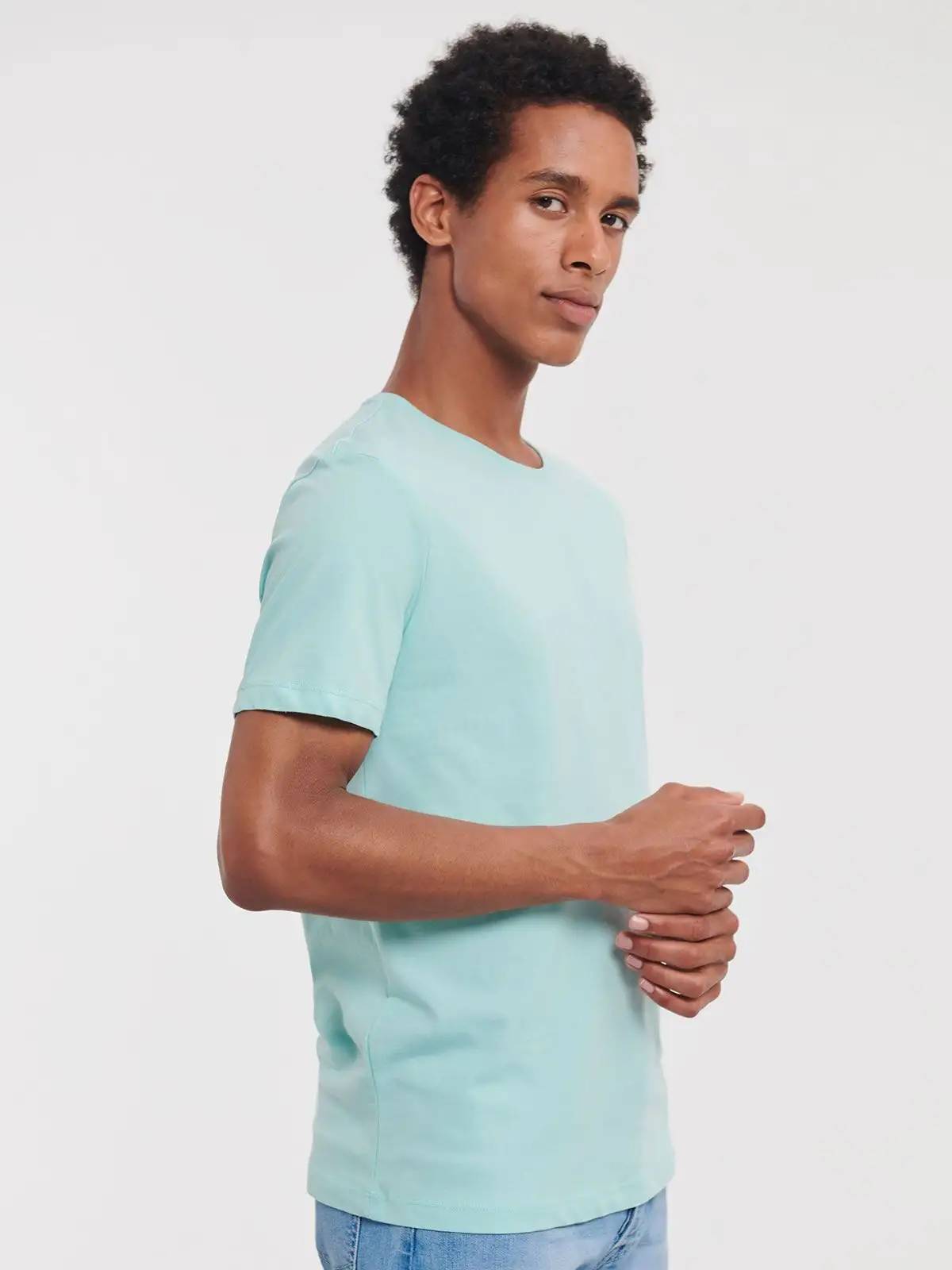 100% Cotone ring-spun organico. T-shirt da uomo con nastro di rinforzo spalla-spalla, fascia del colletto in lycra, cuciture laterali, vestibilità sagomata. (Col. LX 97% cot 3% visc.)