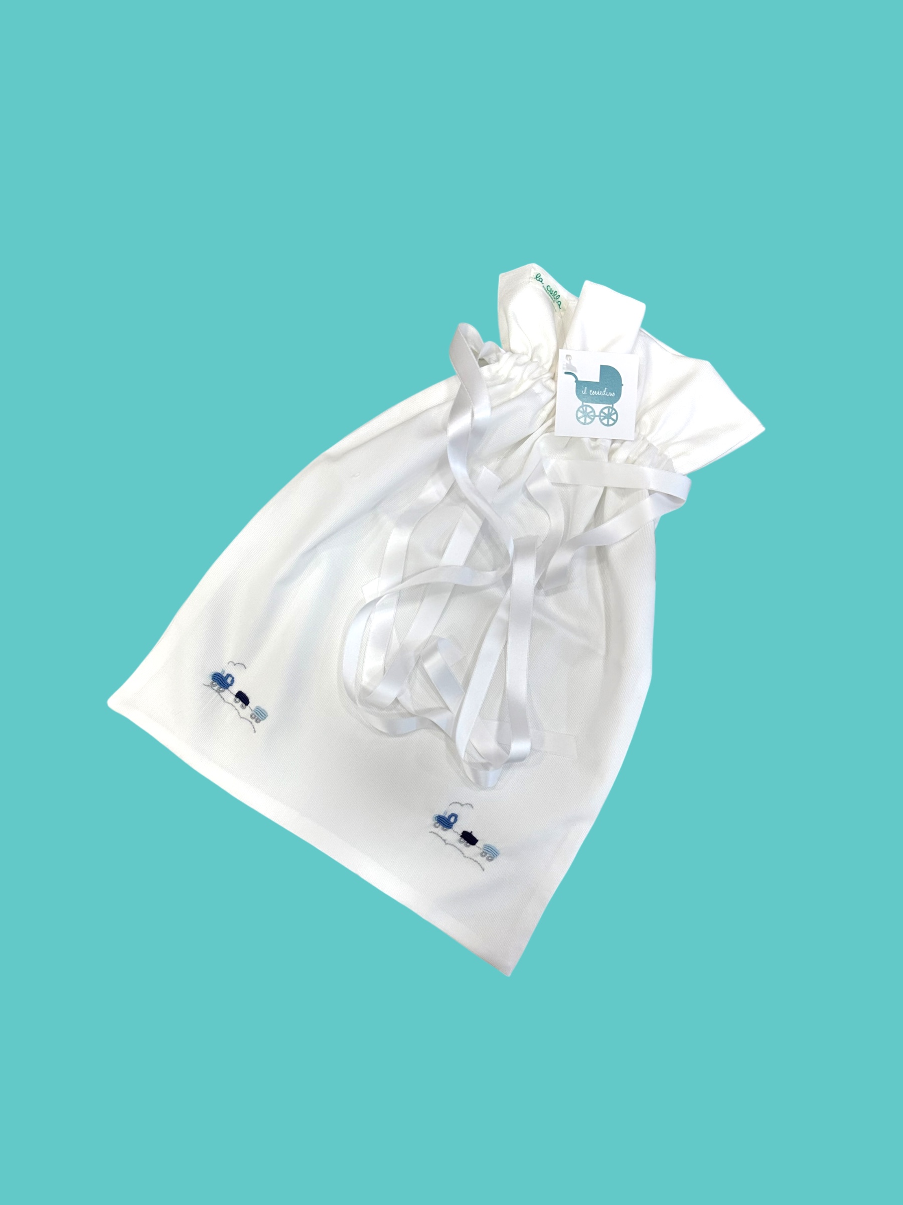 Deliziosa sacca in rigatino di cotone ricamata dove potrai mettere i cambi del tuo piccolo!